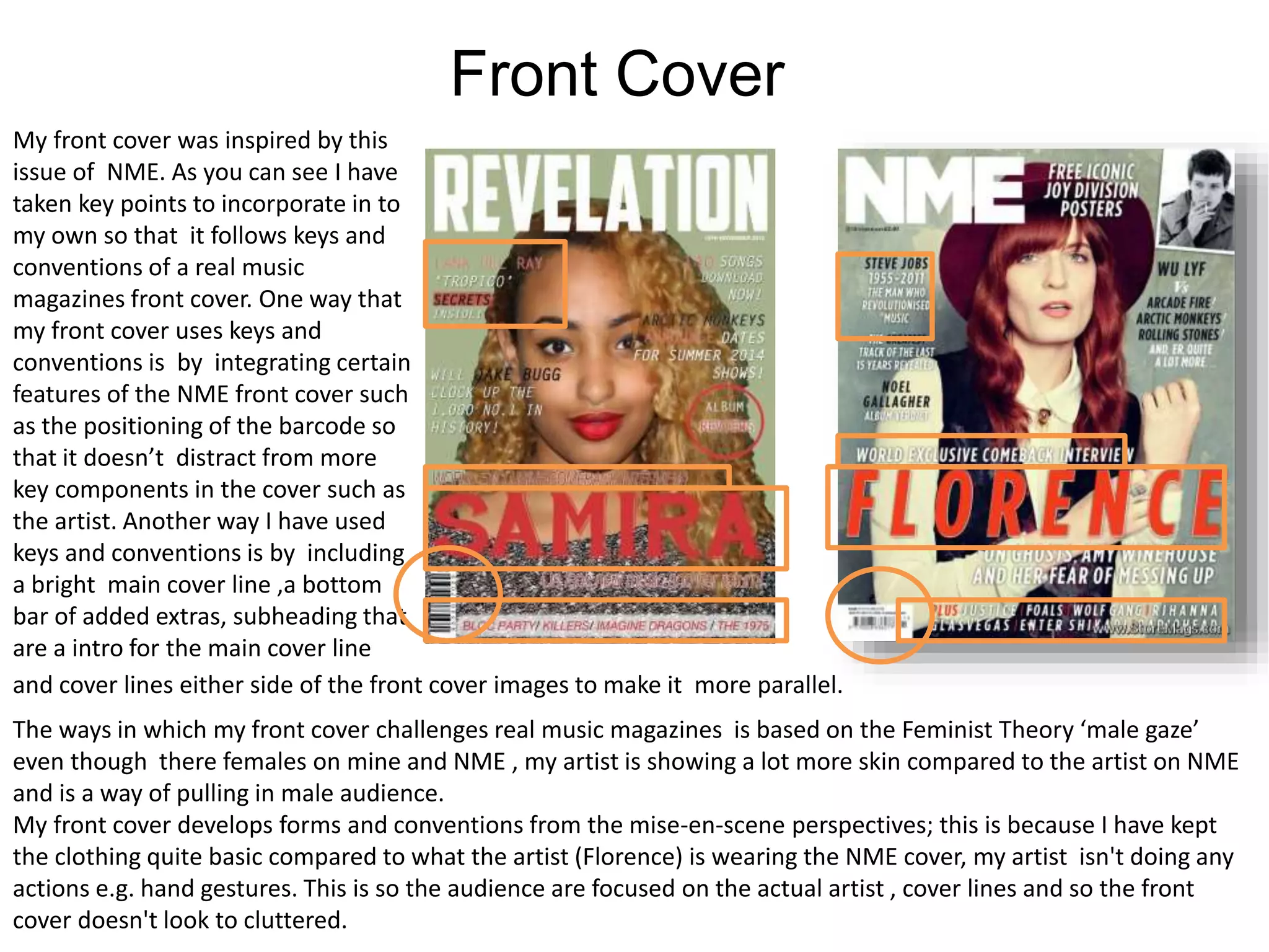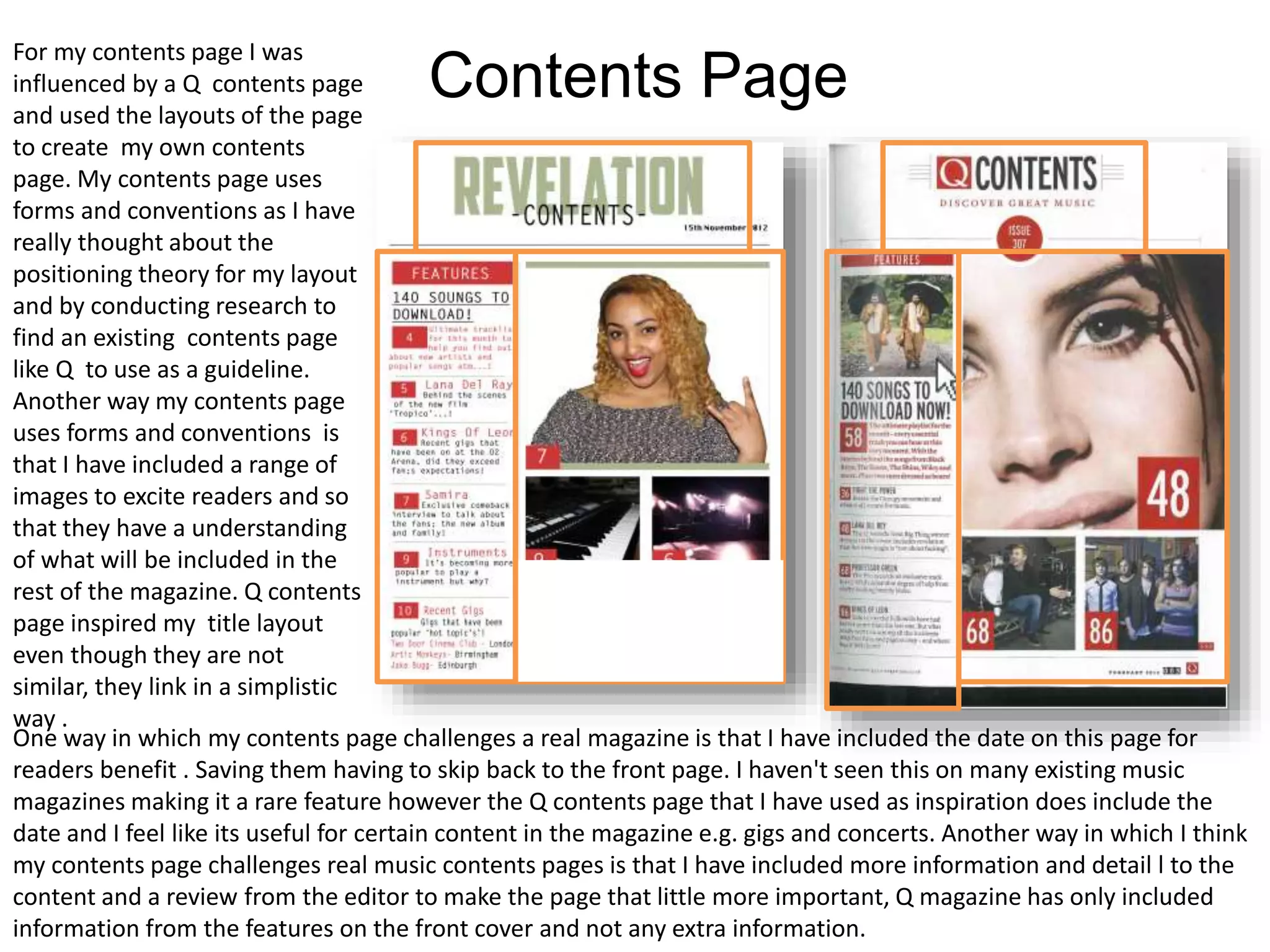 The document discusses the design choices made for different sections of a student-created music magazine, including the front cover, contents page, and double page spread. For the front cover, the student incorporated conventions from an NME cover such as barcode placement. The contents page was influenced by the layout of a Q magazine contents page. The double page spread took inspiration from a Kerrang spread in its interview format and use of images but also includes unconventional elements like a half image and embedded full images. Across the sections, the student considers positioning theory, challenges conventions, and strives to engage and guide readers like a real magazine.