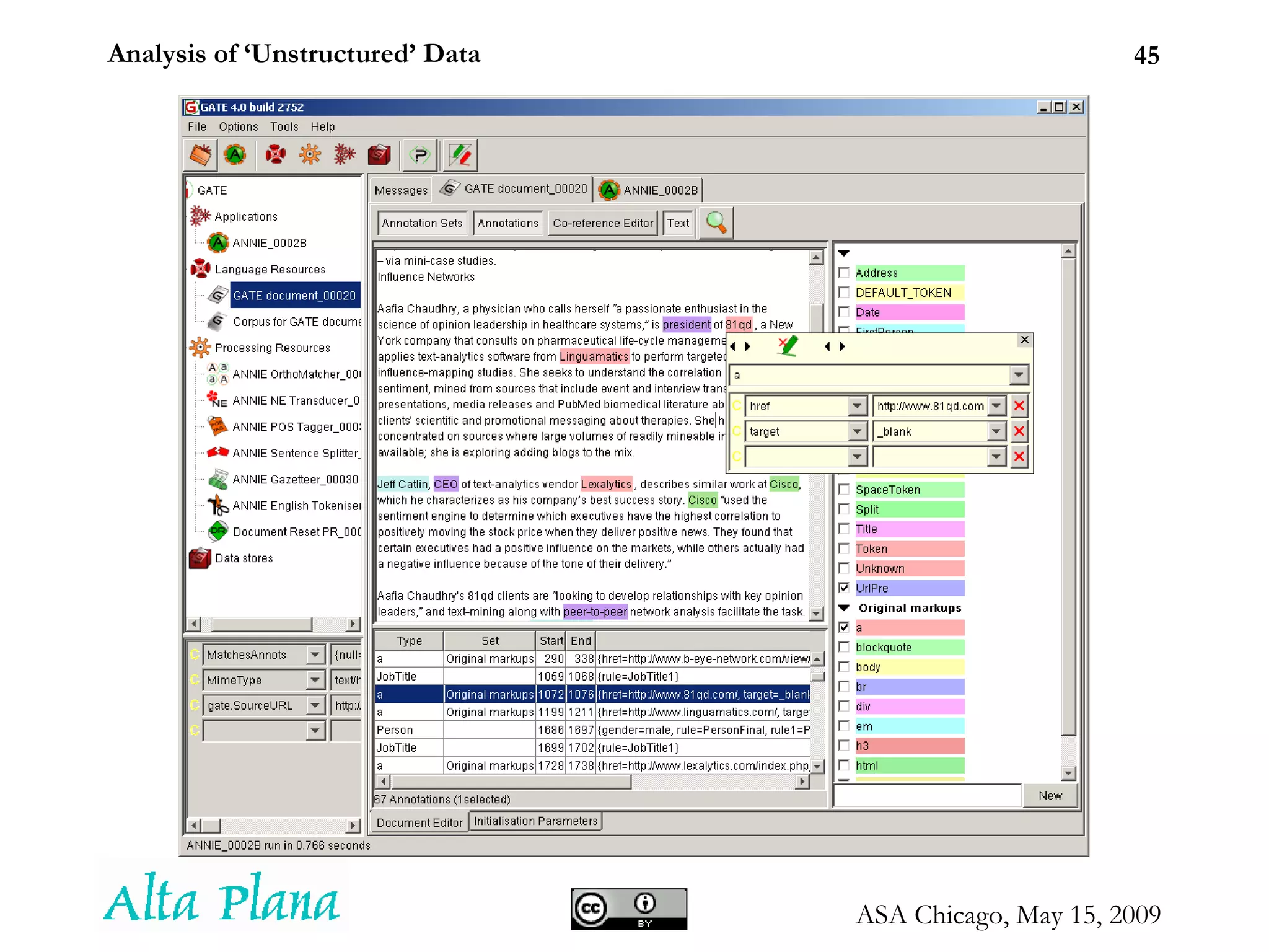 Information extraction Whenwe understand, for instance, parts of speech – <subject> <verb> <object> – we’re in a position to discern facts and relationships. Let's see text augmentation (tagging) in action. We'll use GATE, an open-source tool...