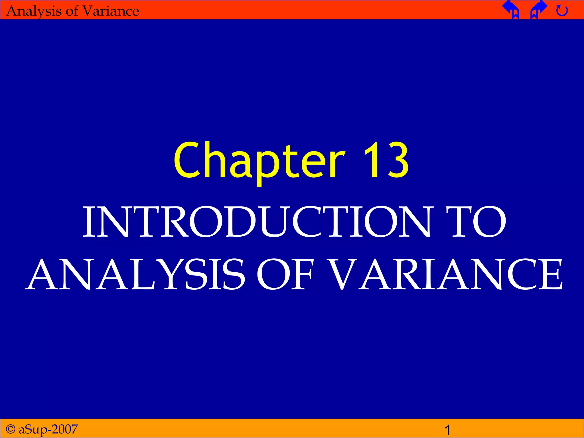 This document provides an introduction to analysis of variance (ANOVA). It defines key terms like factors, levels, and independent/quasi-independent variables. It explains the advantages of ANOVA over t-tests in comparing more than two treatment conditions. Examples are given of one-way ANOVA to compare a single factor with repeated measures and independent measures designs. Two-way ANOVA is introduced for studying the interaction between two factors. Mauchly's test and the assumption of sphericity are also discussed.