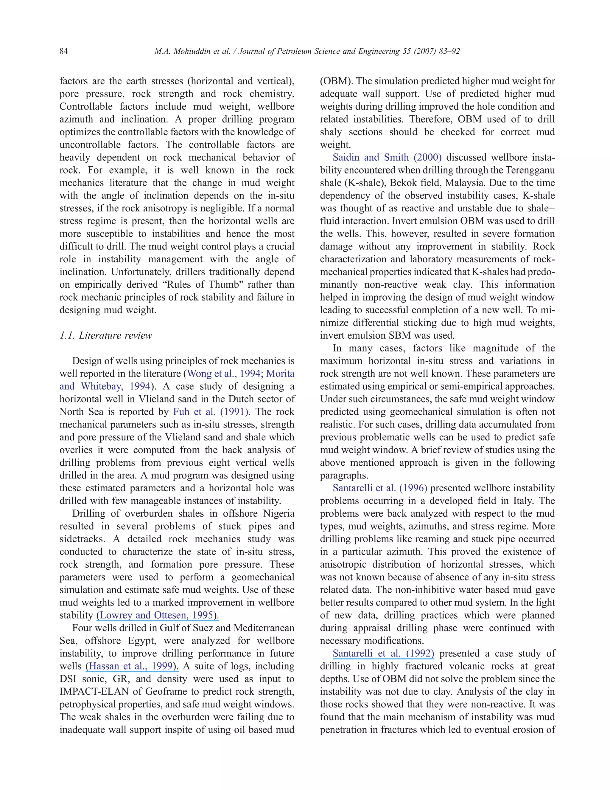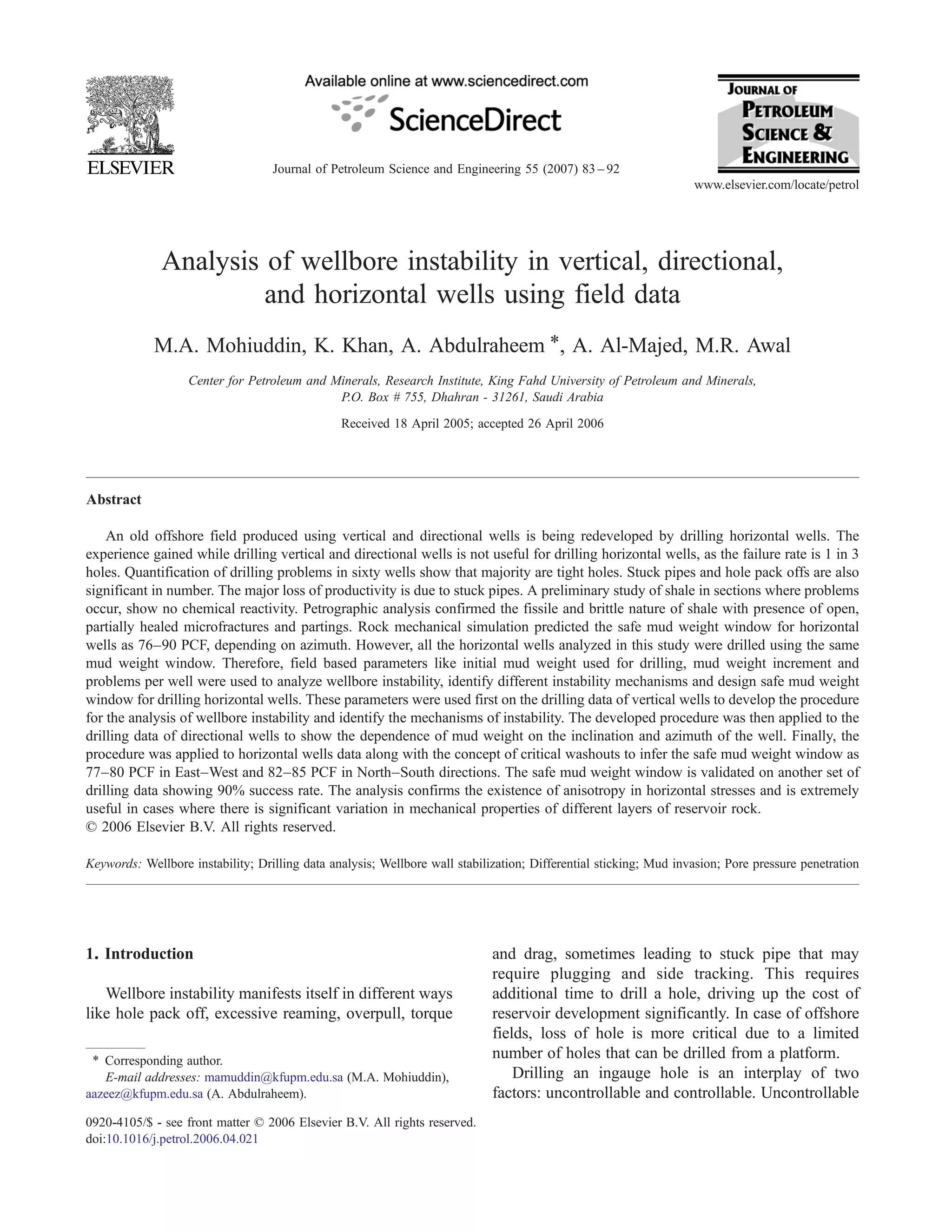This document analyzes wellbore instability in vertical, directional, and horizontal wells using field data from an offshore field being redeveloped by drilling horizontal wells. The analysis identified the major causes of instability in the wells as tight holes, stuck pipes, and hole pack offs. Rock mechanical simulations predicted a safe mud weight window for horizontal wells, but all wells were drilled using the same mud weight. The document then describes analyzing drilling data from the vertical, directional, and horizontal wells to identify instability mechanisms and design optimized safe mud weight windows for each well type and orientation.