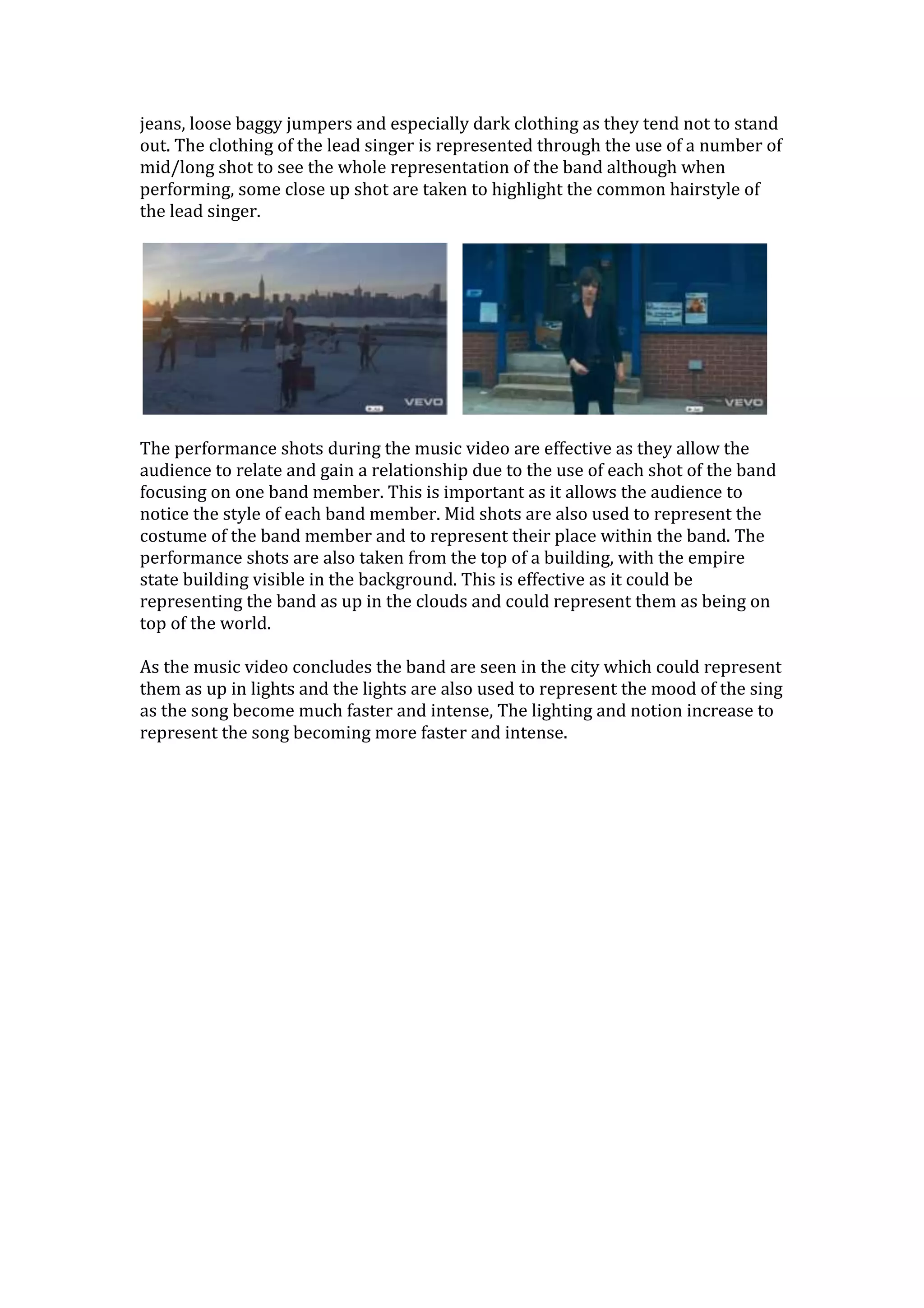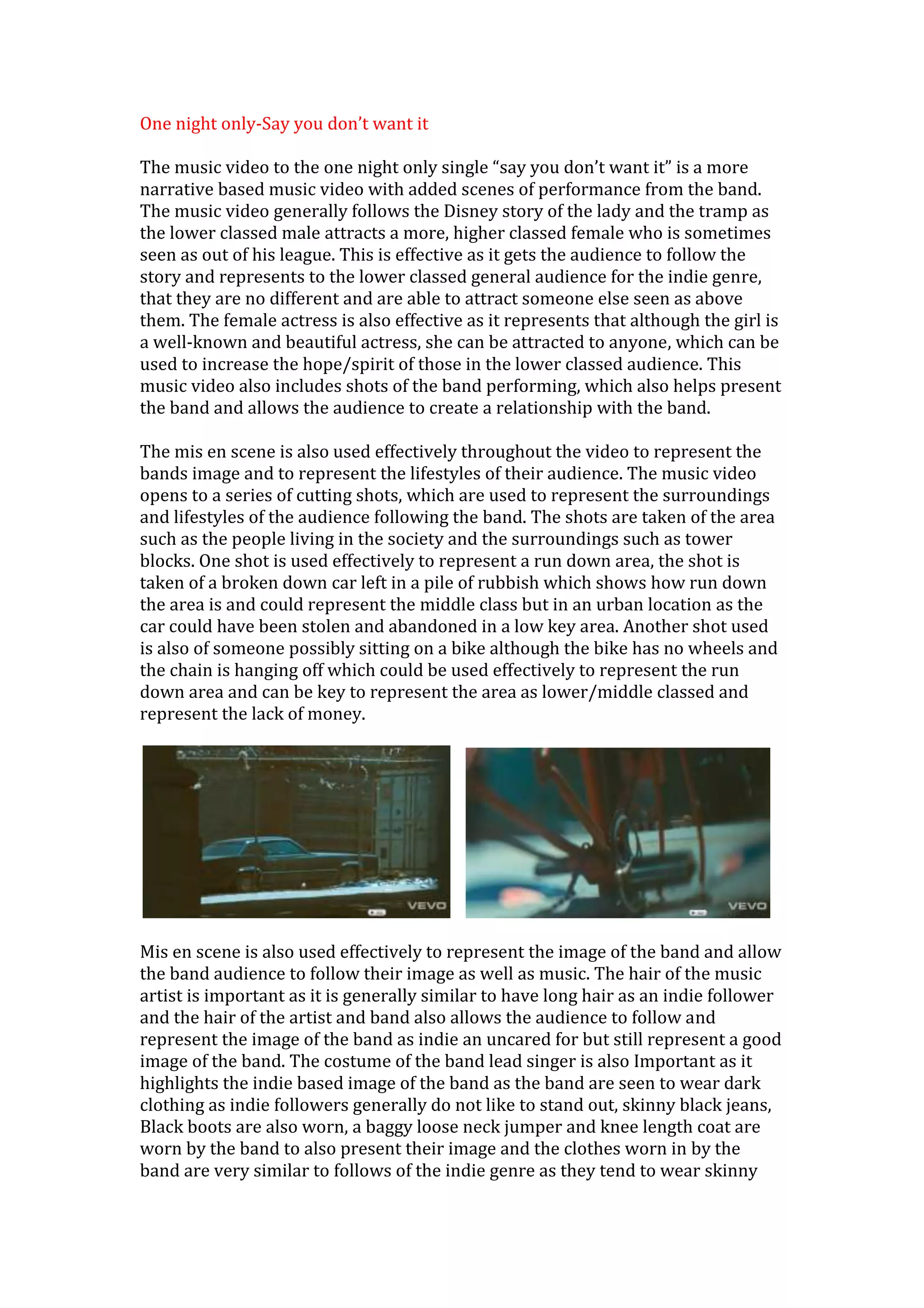The music video for the song "Say You Don't Want It" tells a story similar to Lady and the Tramp, where a lower-class male attracts a higher-class female. Scenes of the band performing are intercut with shots that represent the surroundings and lifestyles of the audience. Mis en scene is used to represent both the run-down areas the audience lives in as well as the indie image of the band through their clothing, hair, and location of performances. Performance shots focus on individual band members to allow the audience to relate to each person's style.