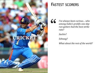 The document discusses different methods of analyzing cricket scoring data to identify the players with the highest strike rates. It provides a table of players from different countries who scored 99 or 98 runs in an ODI match and their strike rates. It then discusses analyzing the data by country, player, runs scored, match date, ground, and opponent to find the highest values in each category. The goal is to systematically analyze the data to identify established high scoring players rather than just the top scores.