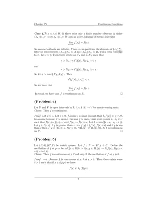 The document contains proofs of various claims about continuous functions between metric spaces. It begins by proving that if a function f is continuous on closed subsets A and B of a metric space E whose union is E, then f is continuous on E (Problem 3). It then proves similar claims about continuity of nondecreasing functions between open intervals in R (Problem 4) and about a function's oscillation and continuity (Problem 5). The document proves several other properties of continuous functions.