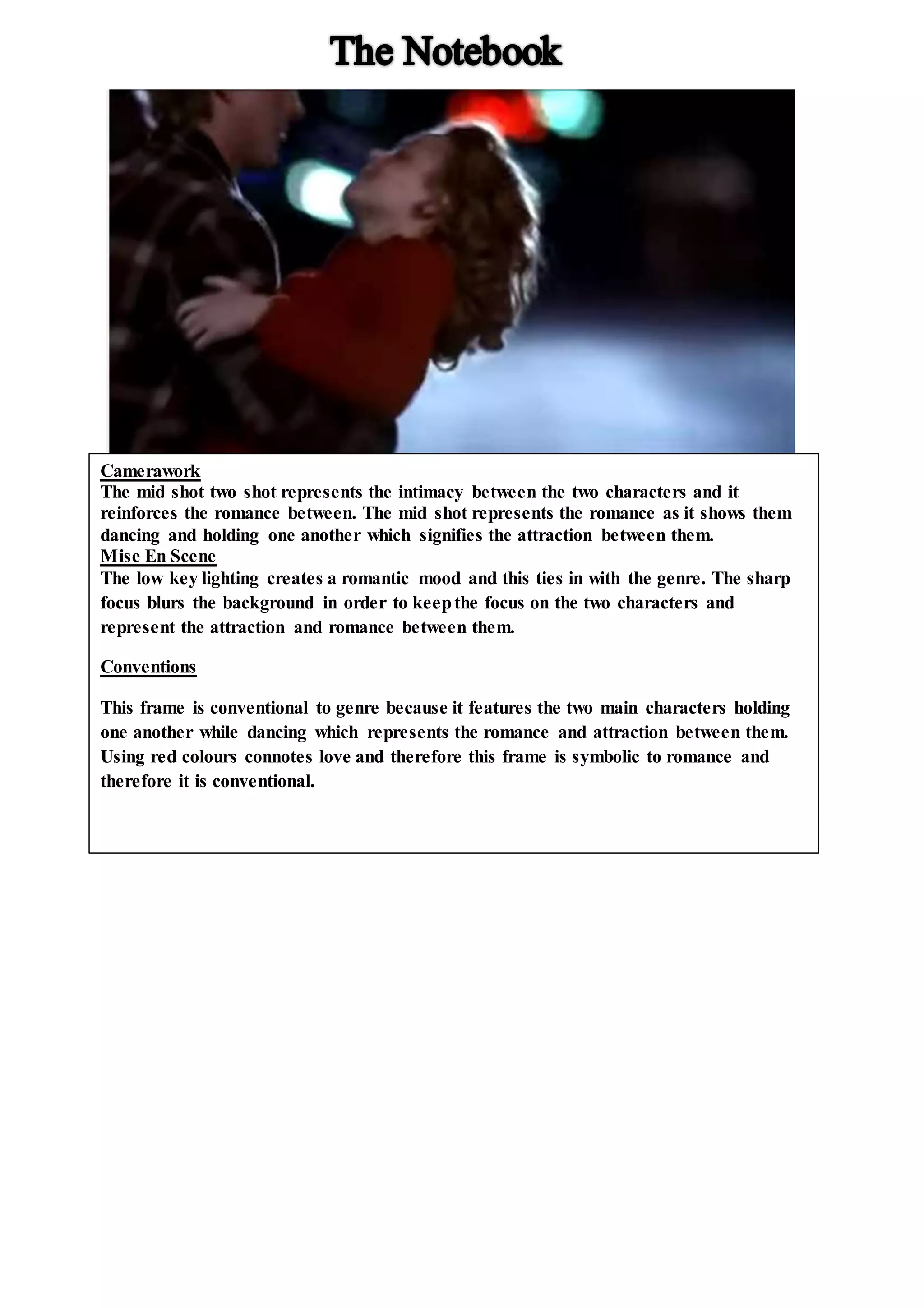 The mid shot two shot represents the intimacy between the two characters and shows them dancing and holding one another, signifying their attraction. The low key lighting creates a romantic mood that ties into the genre. This frame features the two main characters holding one another while dancing, representing the romance and attraction between them.