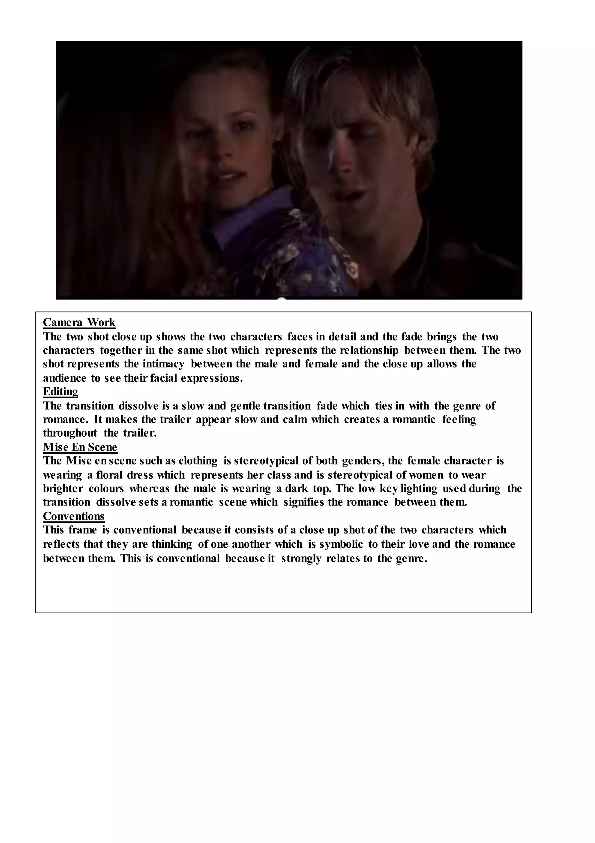 The two shot close up shows the characters' faces in detail and their fade brings them together, representing their relationship. It allows viewers to see their facial expressions. The transition dissolve is a slow, gentle fade that creates a romantic feeling throughout the trailer, tying into the genre of romance.