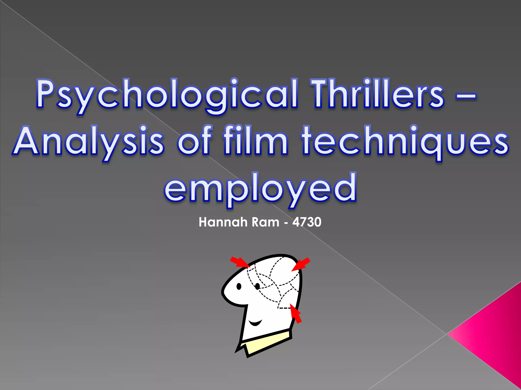 The document analyzes techniques used in the opening sequences of 6 psychological thriller films. It finds that most use red or white titles over images to set a ominous tone. Camera movements like panning are used to create mystery. Close-ups and medium shots are common framing techniques. Eye-level camera angles portray subjects normally at first. Settings tend to be remote or suburban areas. Mise-en-scene like the use of red costumes or props imply danger and psychological issues in the characters. Color, lighting, locations and other visual elements effectively set tones that foreshadow the psychological threats within the films.