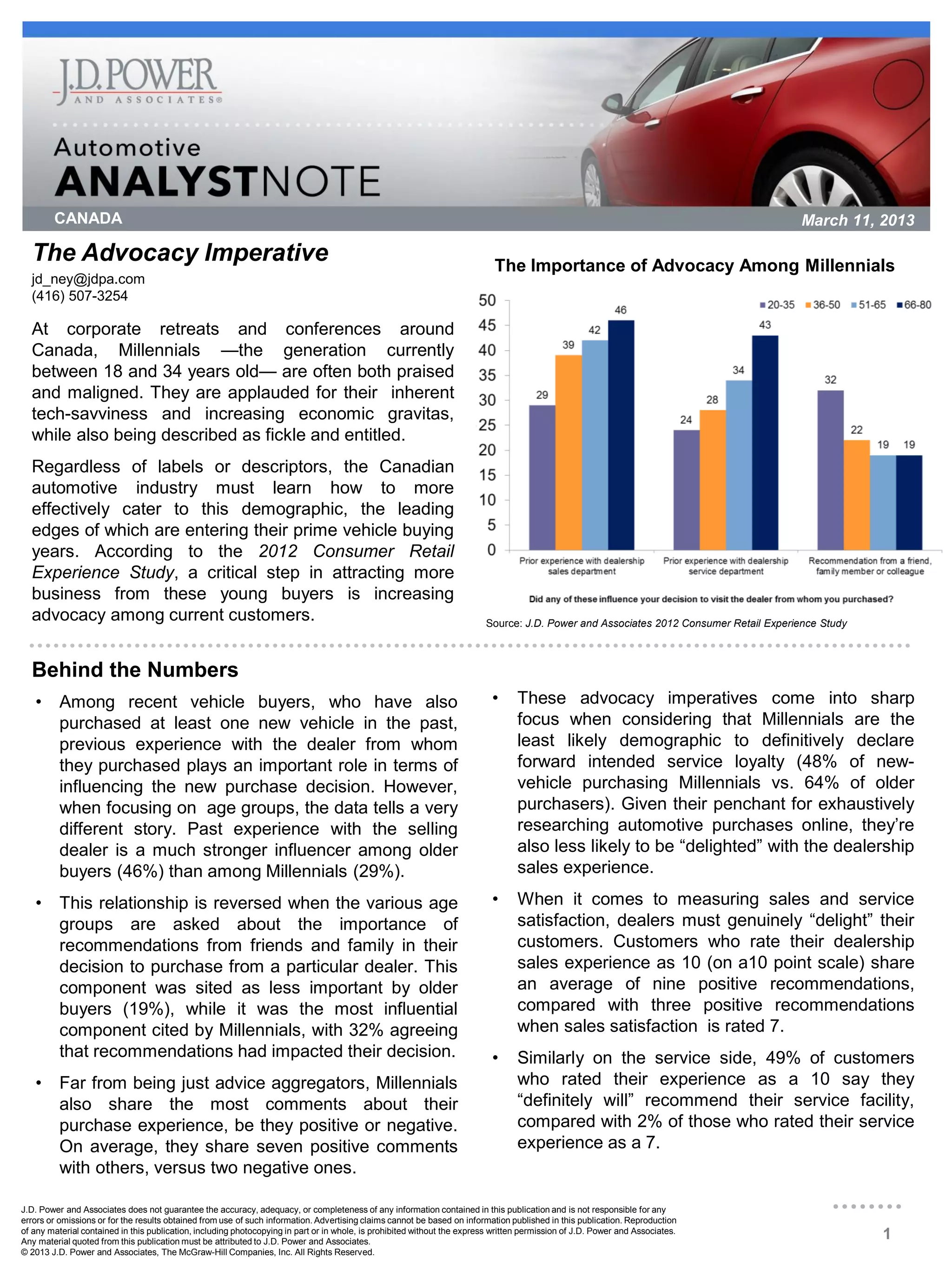 Millennials, aged 18 to 34, are an important demographic for the automotive industry as they enter their prime vehicle buying years. However, they are less loyal to dealers and more influenced by recommendations from friends and family than older buyers. To attract more business from Millennials, dealers must focus on increasing customer advocacy by providing excellent sales and service experiences that delight customers and encourage them to share many positive recommendations.