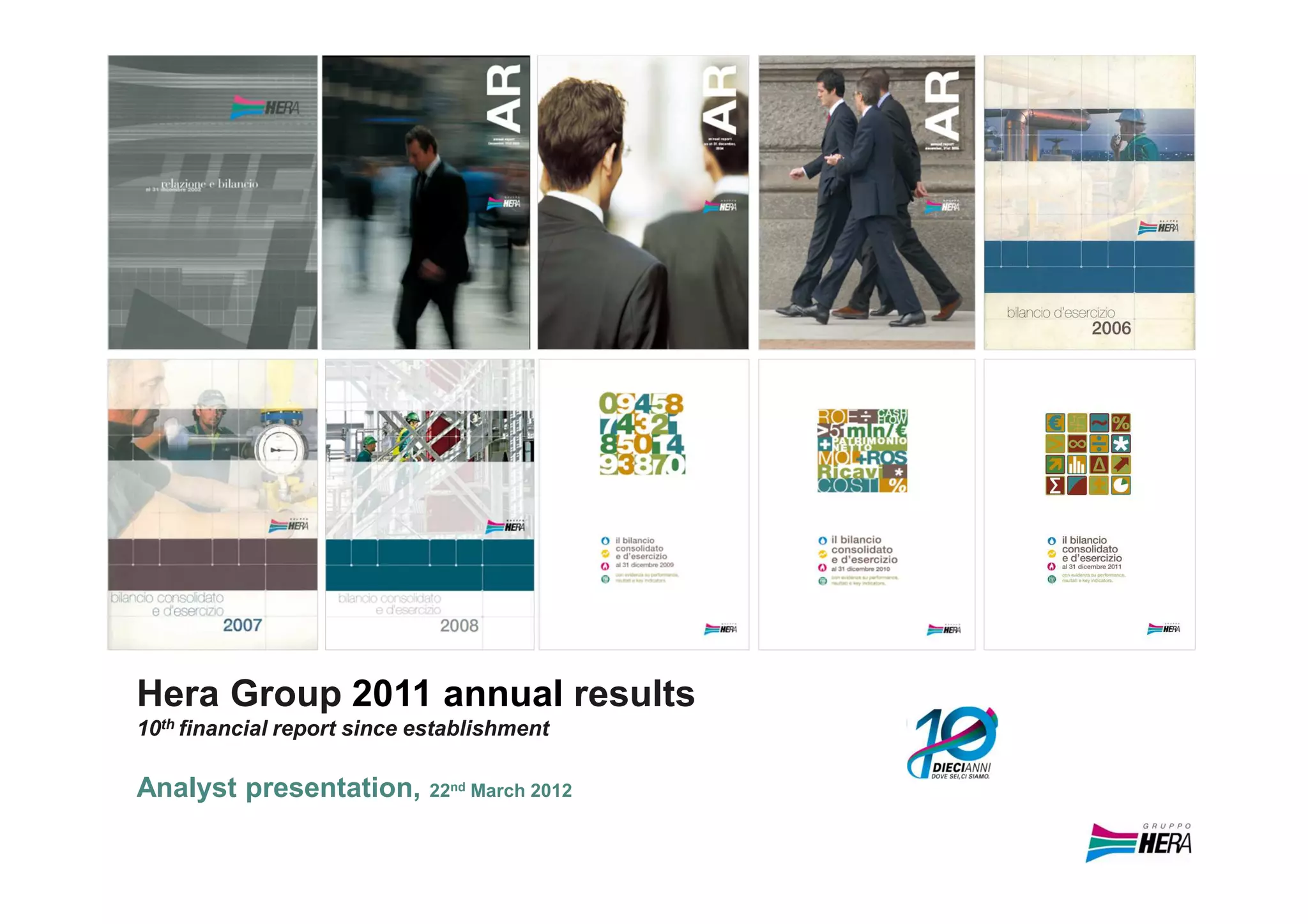 The annual report summarizes Hera Group's strong financial results for 2011, its 10th year in operation. Revenues grew 11.3% to €4.3 billion due to growth across all business lines. EBITDA increased 6.2% to €644.8 million and net profit rose 5.3% to €97.1 million. The results were in line with business plans and maintained the company's track record of resilient performance through the economic crisis.