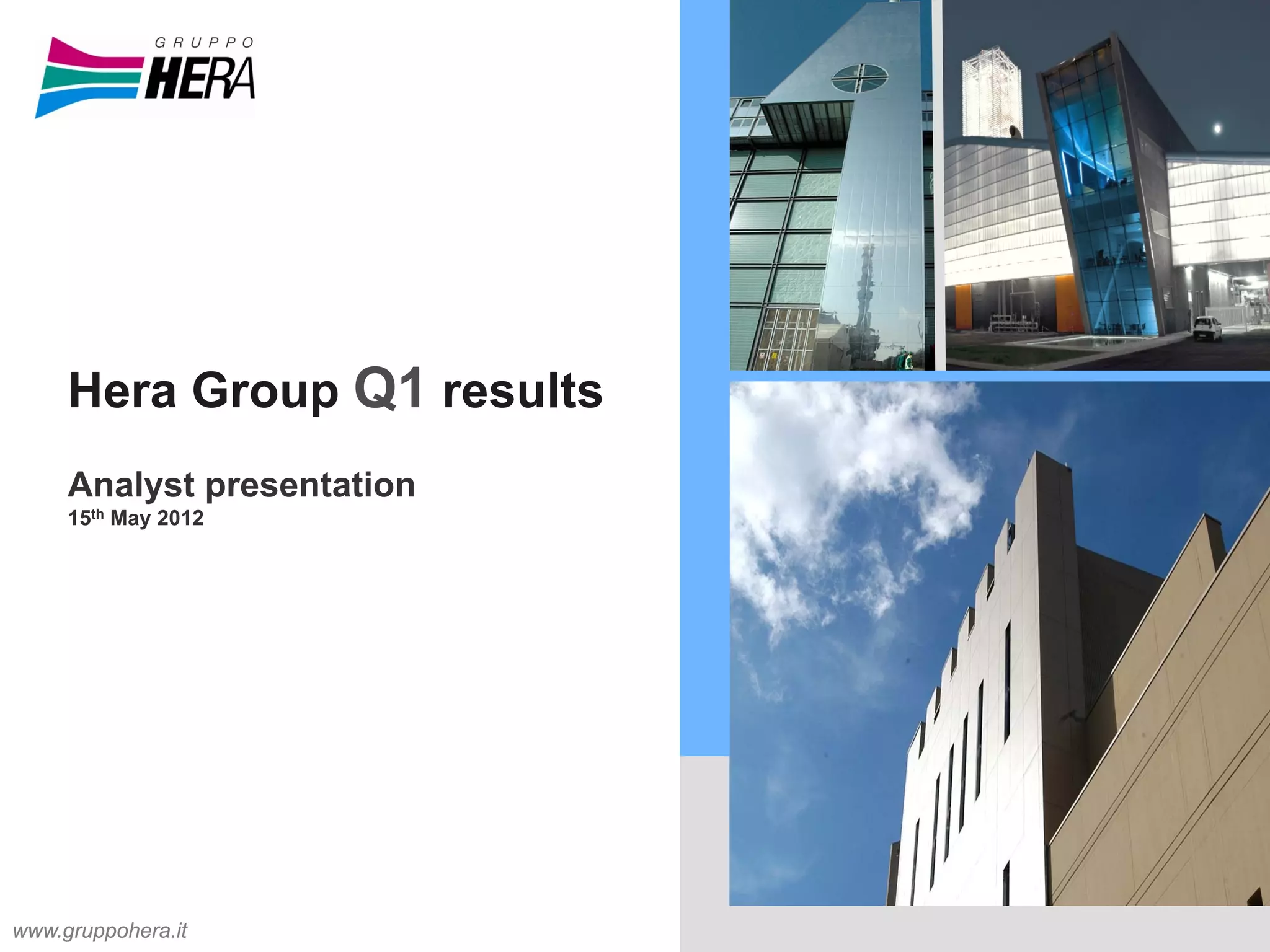 Hera Group reported Q1 2012 results that were largely in line with Q1 2011 results despite impacts from the Italian recession. EBITDA was slightly higher than in Q1 2011 due to performance in operations offsetting higher taxes. Net profits were affected by some extraordinary negative factors totaling around 12.7 million euros. Capex was in line with Q1 2011 and cash generation fully funded capex and seasonal changes in working capital. Net debt remained stable at 2,006 million euros, in line with the end of 2011.