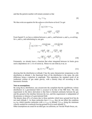 The document discusses the velocity distribution of molecules emitted from a thermal wall and how this distribution changes with altitude under the influence of gravity. It derives equations relating the velocity and temperature distributions at ground level and at a height of 2, ultimately showing that the characteristic temperature remains the same while the amplitude reduces. The analysis relies on assumptions of thermal continuity and the behavior of an ideal gas in a gravitational field.