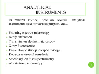 The document discusses various analytical instruments used in mineral science, including scanning electron microscopy (SEM), x-ray diffraction (XRD), and x-ray fluorescence (XRF), among others. It outlines the principles, applications, strengths, and limitations of each instrument, emphasizing their roles in analyzing crystalline materials and mineral identification. Additionally, it highlights techniques such as electron microprobe analysis (EPMA) and secondary ion mass spectrometry (SIMS), providing a comprehensive overview of their functionalities.