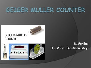 1) A Geiger-Muller counter detects ionizing radiation by measuring the pulses produced when radiation particles pass through a gas-filled tube and cause ionization.