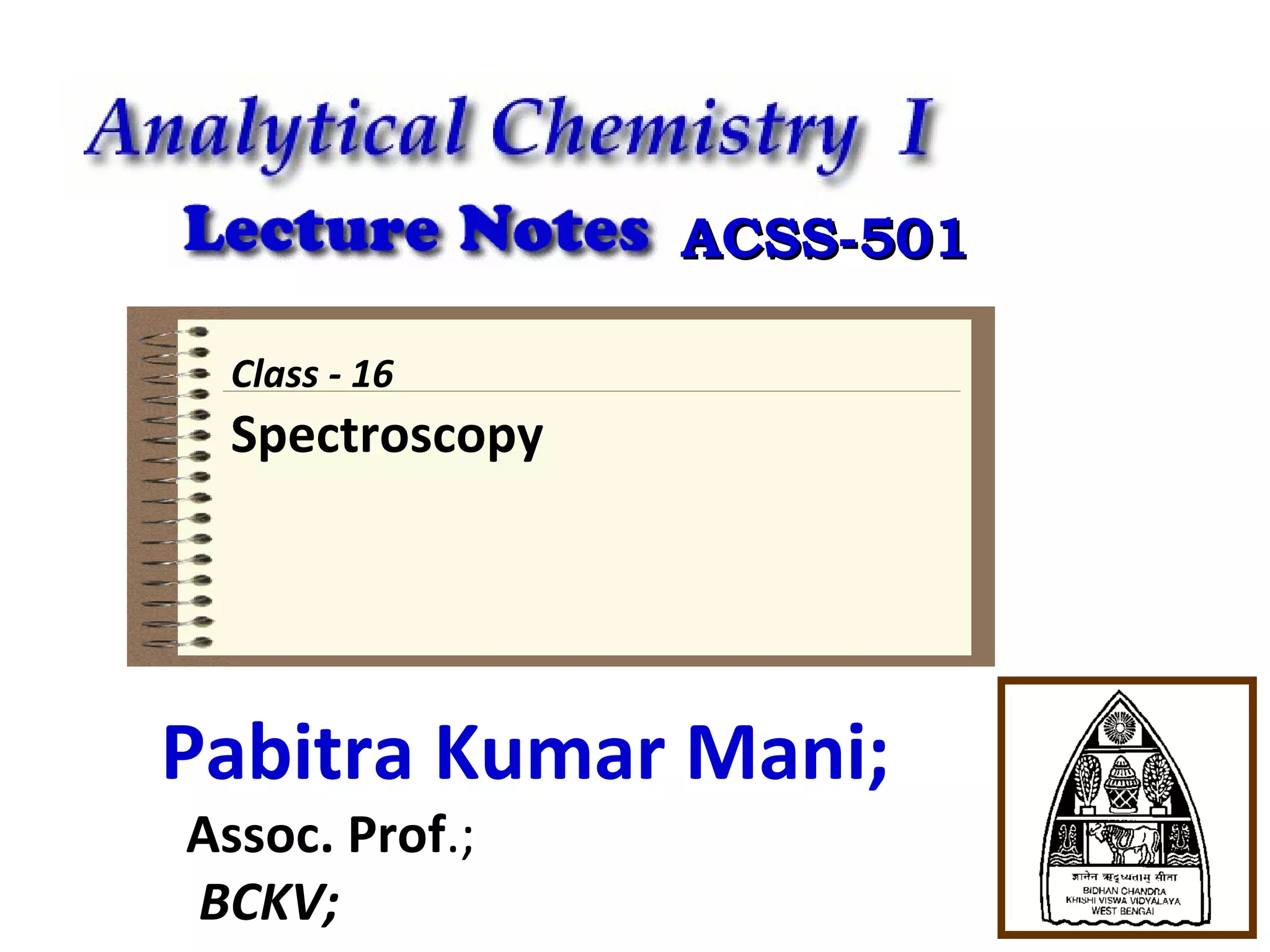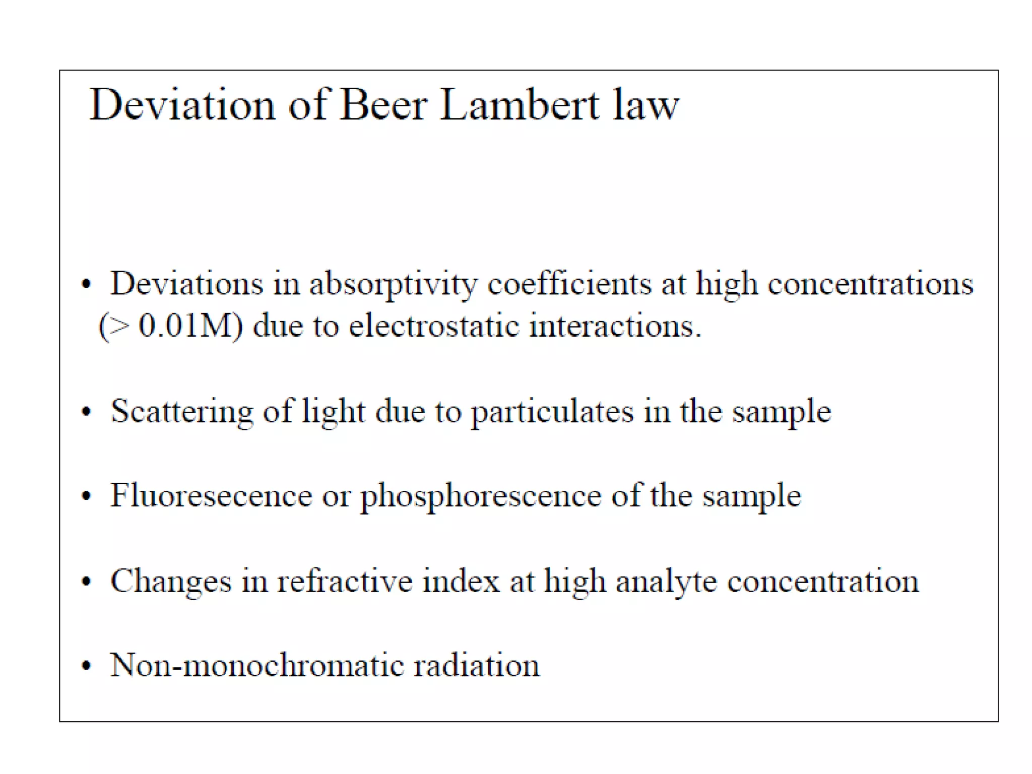 This document provides information about spectroscopy and spectrophotometry. It discusses the different regions of the electromagnetic spectrum that spectroscopy and colorimetry are concerned with, including the ultraviolet, visible, and infrared regions. It explains the relationship between the wavelength of light and photon energy. The document also summarizes Beer's law and how it relates absorbance to analyte concentration, molar absorptivity, and path length. Limitations to Beer's law at higher concentrations are discussed. The summary provides key equations for absorbance, transmittance, and determining unknown concentrations from calibration curves.