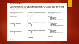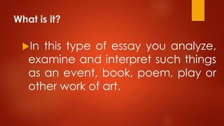 The document provides guidance on writing an analytical essay. It explains that an analytical essay examines a work of art or event to interpret its meaning and significance. The document outlines the prewriting, writing, and finalizing steps for an effective analytical essay. This includes developing a thesis, finding evidence to support the thesis, writing an introduction, body paragraphs with analysis and evidence, and a conclusion that restates the thesis and broader implications. Proofreading and clarity of writing are emphasized.