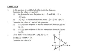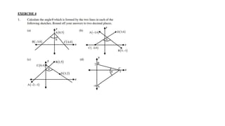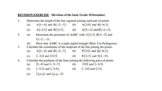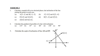 This document provides an introduction to analytical geometry for grade 11 students, focusing on concepts such as the distance between points, midpoints, gradients, and the inclination of lines. It revises key grade 10 topics and introduces equations of straight lines along with applications involving quadrilaterals. The chapter includes examples and scenarios that illustrate how to calculate angles and relationships between lines.