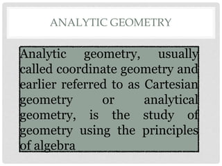 The document discusses analytic geometry, which is the study of geometry using algebraic principles. It examines different types of plane intersections with cones, such as planes that are parallel, perpendicular, or neither parallel nor perpendicular to the cone's axis of symmetry. It also covers one, two, and three dimensional spaces, ordered pairs, angles including horizontal, vertical, acute and obtuse, and finding the inclination of a line using its slope-intercept form equation.