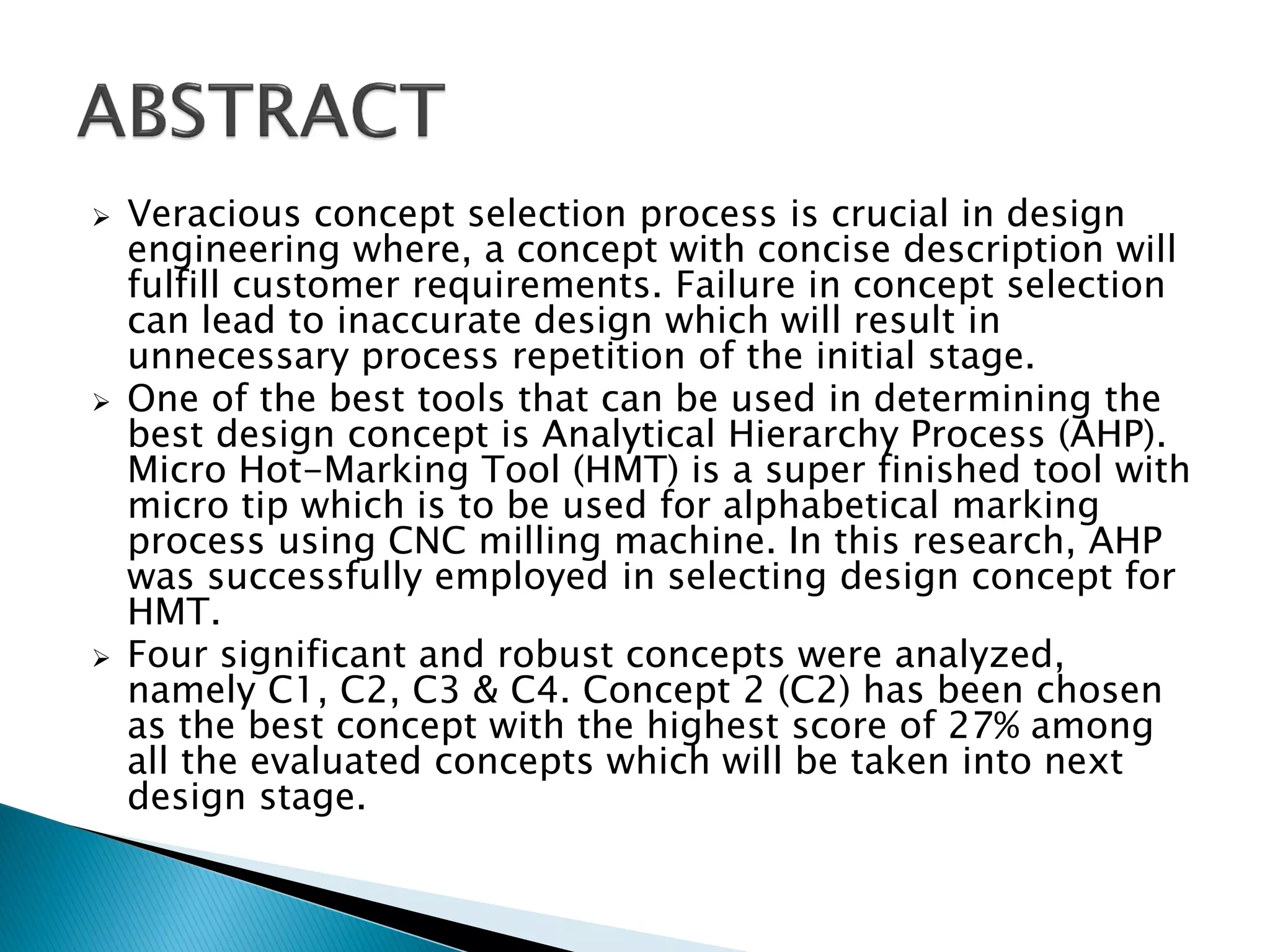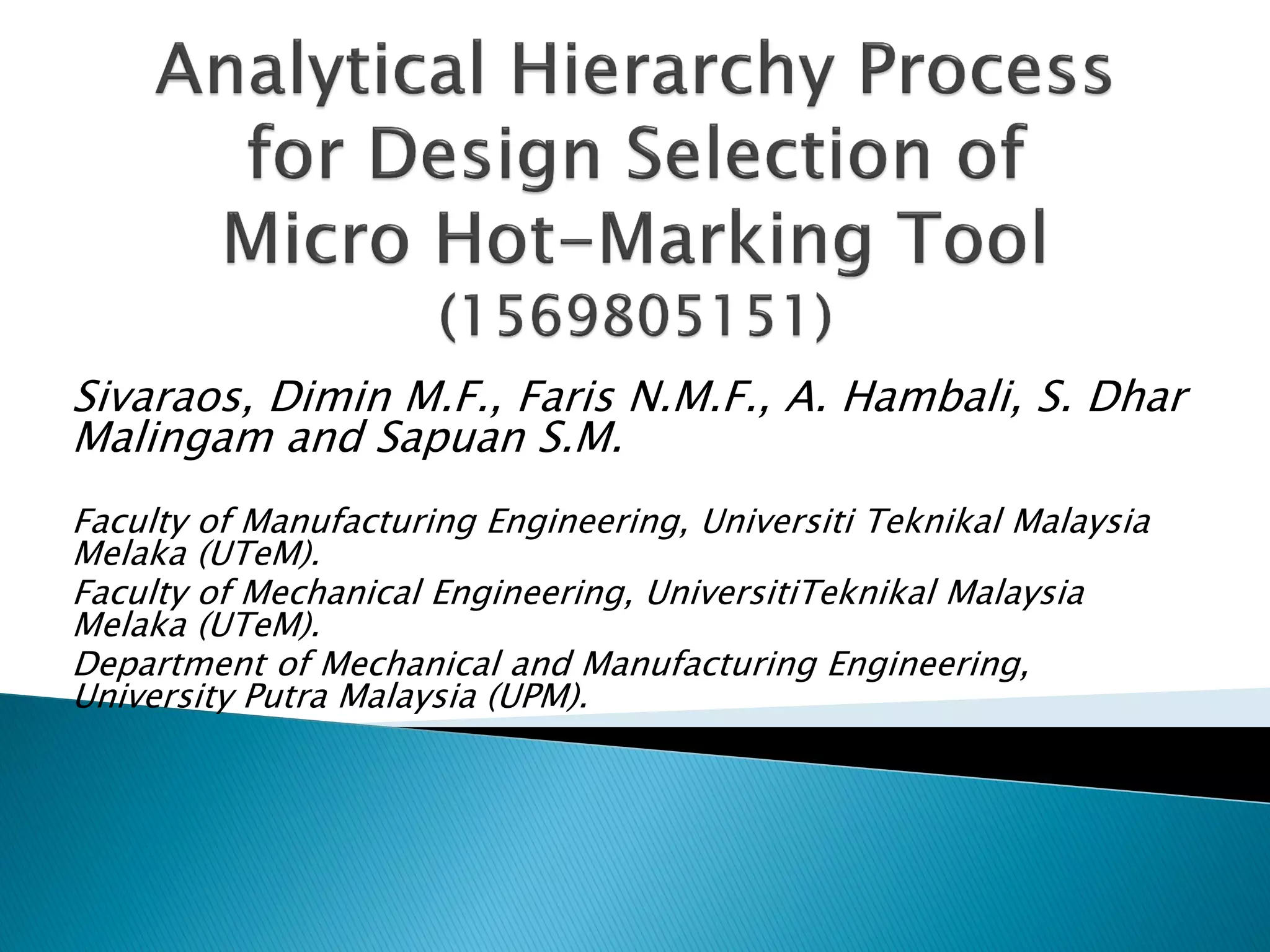 - The document describes a study that used the Analytical Hierarchy Process (AHP) to select the best conceptual design for a Micro Hot-Marking Tool (HMT) out of four alternatives.