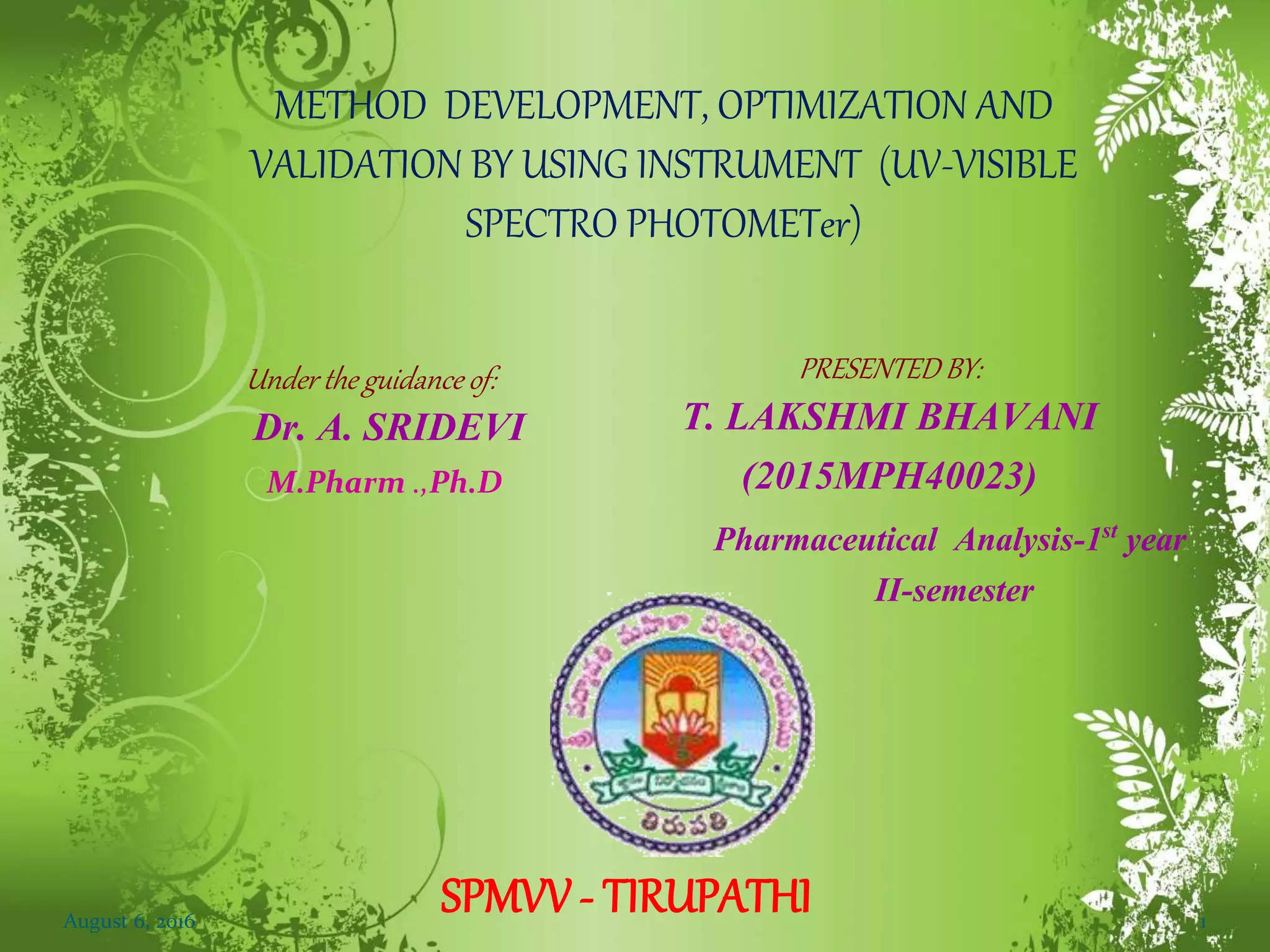 The document describes the development and validation of UV spectrophotometric methods for analyzing risperidone and lacosamide. It discusses selecting analytical wavelengths, developing standard curves, and validating the methods by determining accuracy, precision, specificity, linearity, range and other parameters as required by ICH guidelines. Validation results for the risperidone and lacosamide methods such as recovery percentages between 98.4-99.8%, precision of 0.67-0.50%, linear ranges of 2-6 μg/ml and 12-40 μg/ml respectively are also presented. The developed and validated methods provide accurate and precise quantification of active pharmaceutical ingredients and finished dosage forms using UV spectrophotometry.