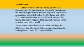 This document provides a summary of analytical method validation. It discusses the types of analytical procedures that should be validated, including identification tests, quantitative impurity tests, limit tests, and active moiety assays. It also summarizes key validation characteristics that should be considered, such as accuracy, precision, specificity, range, detection limit, quantitation limit, linearity, and robustness. The document provides definitions and methodology recommendations for validating analytical procedures. It emphasizes that the validation process verifies that an analytical method is suitable for its intended purpose.