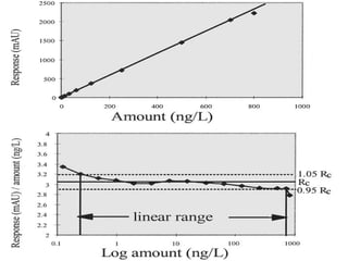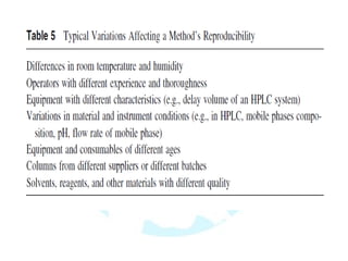 The document is a presentation on analytical method validation, focusing on its importance in ensuring that analytical procedures meet requirements for drug substances and products. It outlines various considerations for validation, including instrument suitability, method specificity, accuracy, precision, and detection limits, along with related guidance documents. Key concepts like robustness, linearity, and system suitability testing are emphasized to ensure reliable and accurate analytical results.