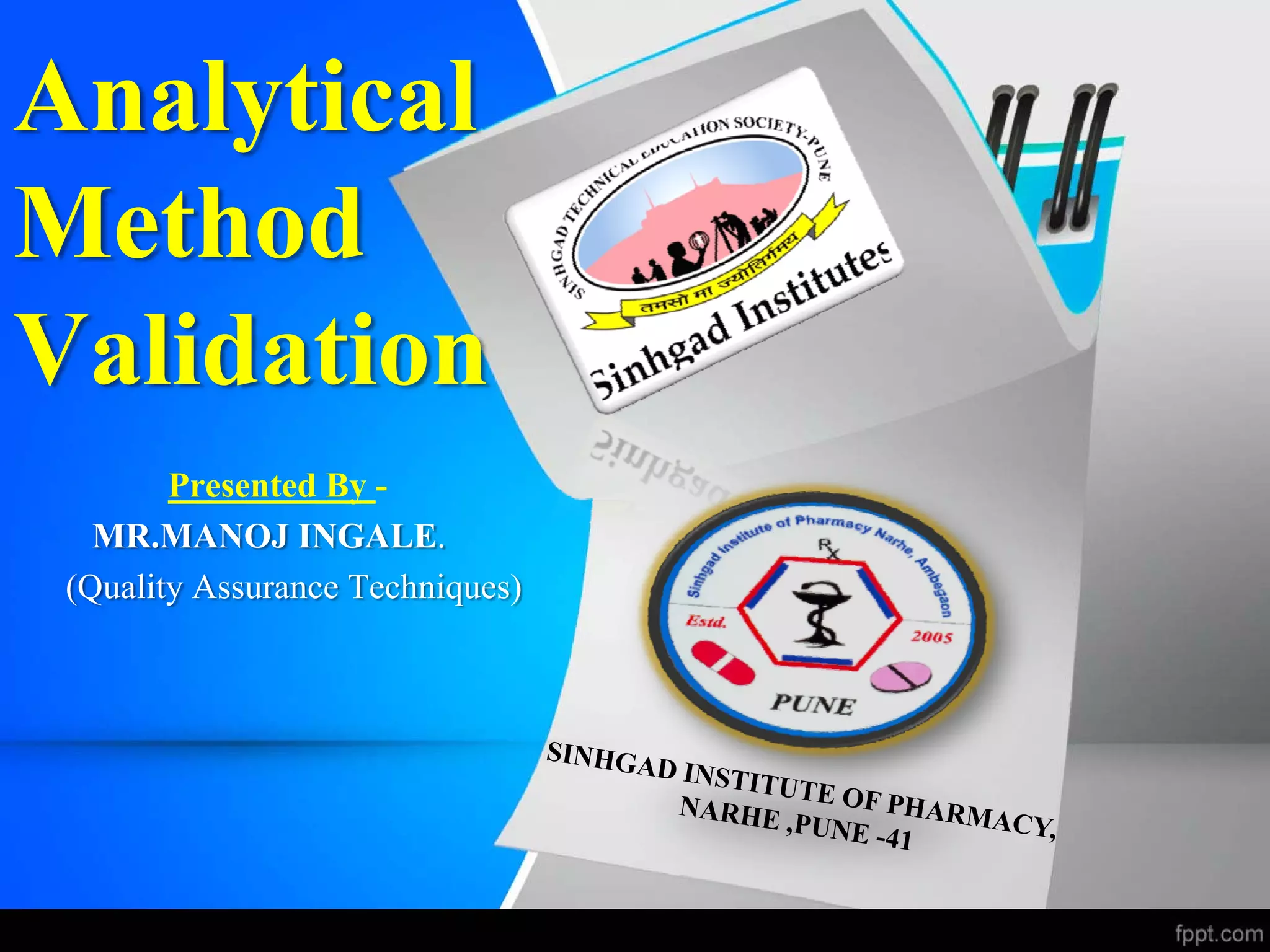 The document outlines the regulatory guidelines and considerations for analytical method validation, focusing on parameters such as accuracy, precision, specificity, and robustness, based on various established standards. It details criteria for different types of analytical procedures, validation characteristics, and the importance of systematic evaluations like system suitability. Additionally, the document presents examples of validation studies conducted on specific compounds to demonstrate the application of these principles.