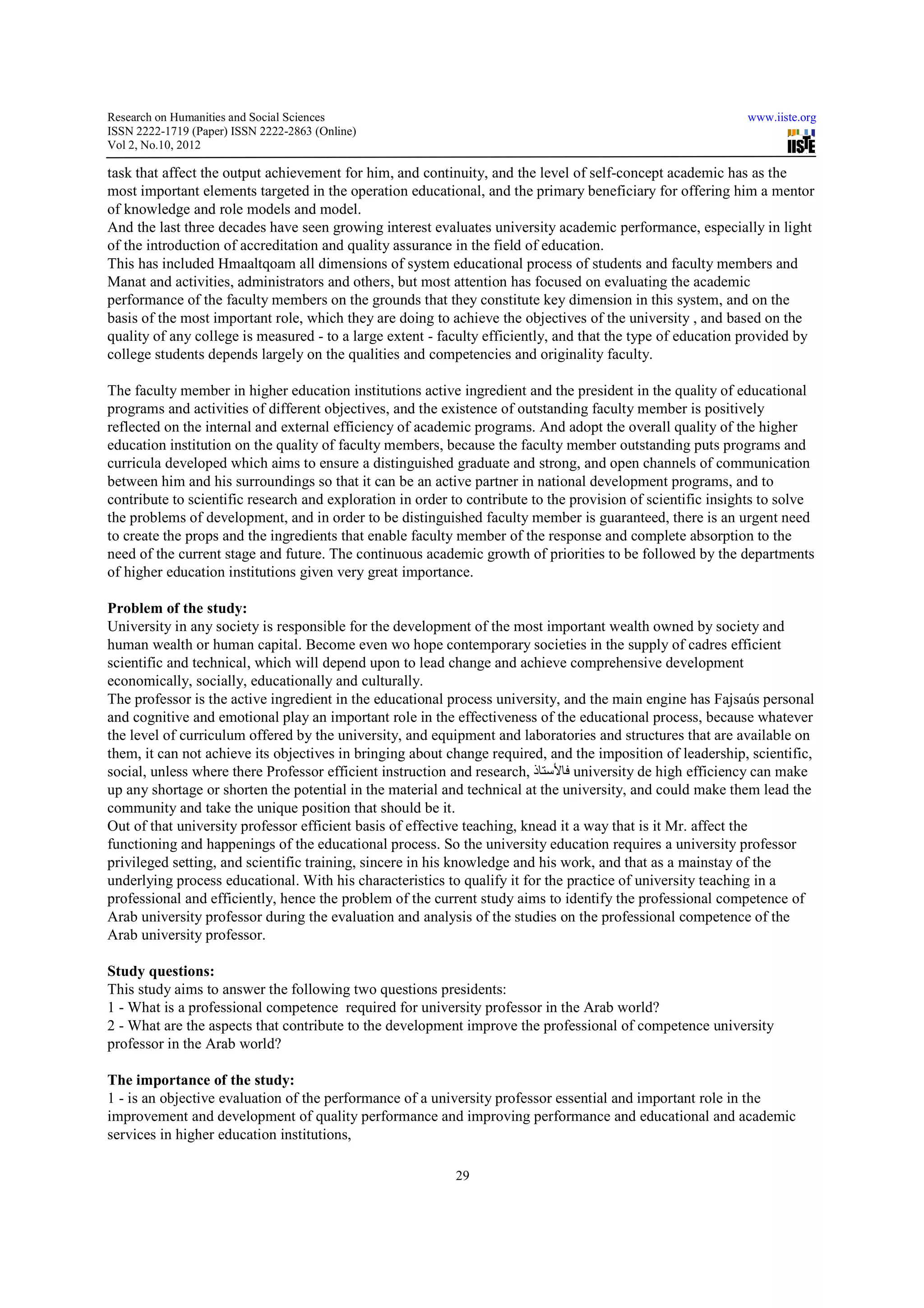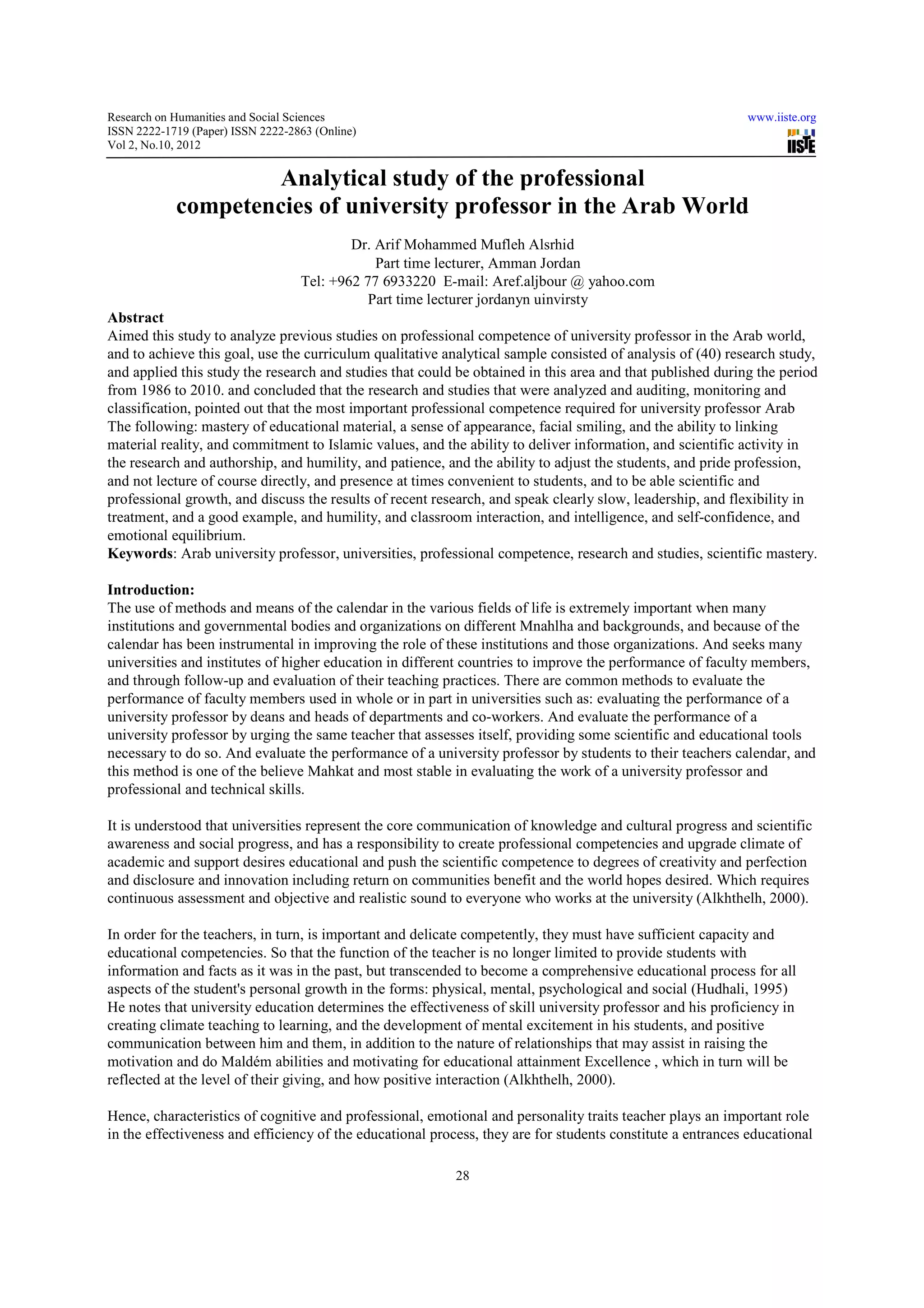This document analyzes 40 previous studies on the professional competencies of university professors in the Arab world. It finds that the most important competencies include: mastery of educational material, good appearance, smiling, ability to connect material to reality, commitment to Islamic values, ability to deliver information effectively, scientific research and publishing, humility, patience, ability to adapt to students, pride in one's profession, not lecturing directly from course materials, being available to students, commitment to continuous self-improvement, discussing recent research findings, clear and slow speaking, leadership, flexibility, being a good role model, humility, classroom interaction, intelligence, self-confidence, and emotional stability. University professors are key to achieving educational objectives and quality depends