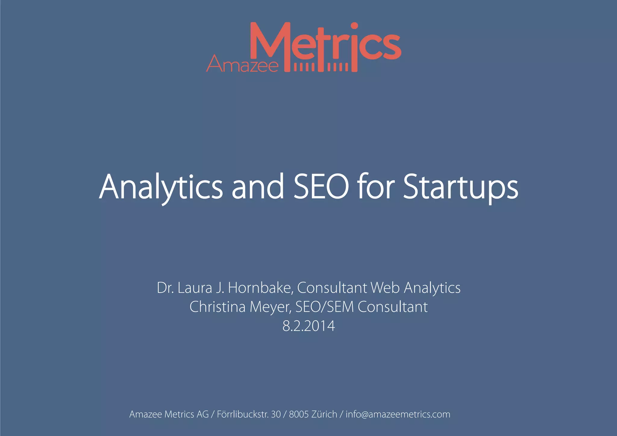 This document provides an overview of web analytics and search engine optimization (SEO) strategies for startups. It discusses using web analytics to understand website audiences, how visitors find and use the site, and measuring key metrics. For SEO, it outlines technical optimization strategies like keyword research, on-page elements, internal linking, and site speed. The goal is to help startups make data-driven decisions to improve performance.