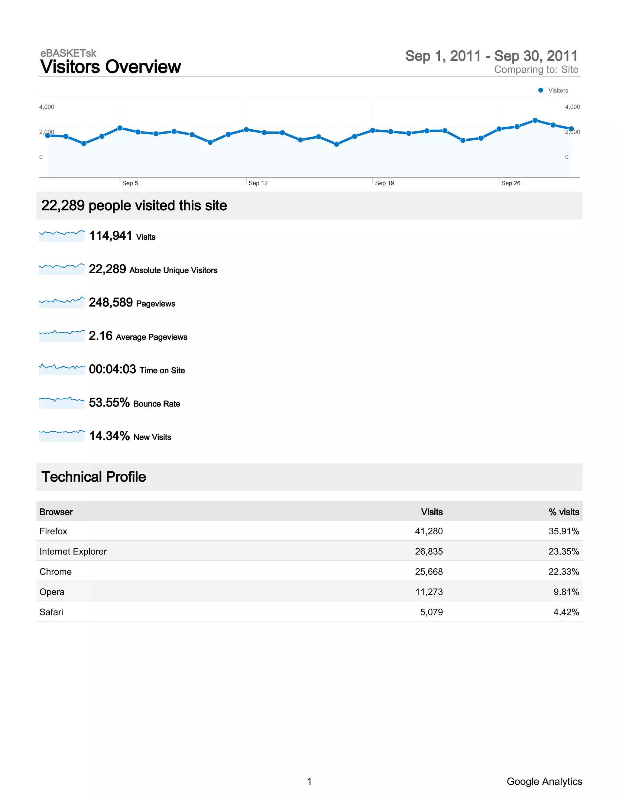 The document is a report from Google Analytics summarizing website traffic for a site between September 1-30, 2011. It shows that there were 22,289 visitors who made 114,941 visits to the site, viewing 248,589 pages over an average time of 4 minutes and 3 seconds. The bounce rate was 53.55% and 14.34% of visits were from new visitors. Firefox was the most commonly used browser, accounting for 35.91% of visits.