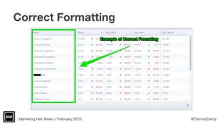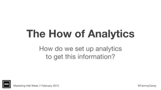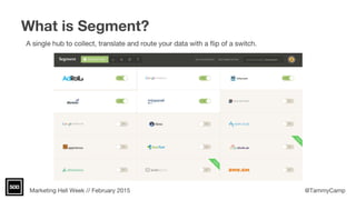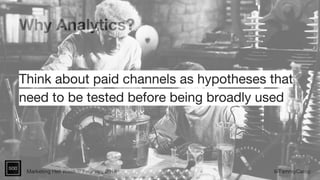 This document provides guidance on identifying and tracking users for marketing purposes. It discusses when and how to identify users, including using email, account creation date, and client-side and server-side methods. Good user traits to track are listed, and it is noted that analytics can help segment and target users. Funnel events and a sample funnel format are presented, including examples for e-commerce and an art website. Maintaining an analytics strategy is important for testing, understanding user behavior, and determining next steps. The document emphasizes establishing a finite set of standardized event names and properties for consistency.