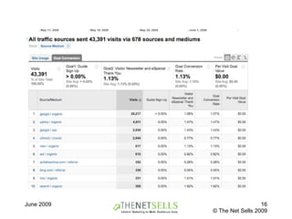 The document outlines strategies for optimizing a hospitality website to increase leads and sales, emphasizing the importance of continuous improvement based on business objectives and data analysis. It highlights tools like Google Analytics and AdWords for monitoring traffic sources, evaluating page performance, and measuring conversion goals. Additionally, it discusses the significance of tracking visitor behavior and using analytics reports to inform marketing strategies and enhance overall website effectiveness.