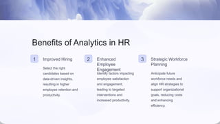 This document discusses how analytics can revolutionize HR practices and drive organizational success. It highlights benefits like improved hiring through data-driven insights, enhanced employee engagement by identifying satisfaction factors, and strategic workforce planning to anticipate needs. Common metrics like turnover, time to fill positions, and training ROI are examined. Analytics tools and challenges are also reviewed, with case studies showing outcomes like reduced turnover and increased productivity. The importance of HR analytics for strategic alignment, talent management, continuous improvement, and informed decision making is emphasized.
