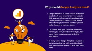 Google Analytics is a free tool that allows users to track and analyze website traffic and user behavior. It provides key metrics such as number of visitors, traffic sources, which pages are most popular, and user behavior on the site. These insights allow users to better understand how people are interacting with their website and how to optimize it. Some benefits of Google Analytics include helping users avoid relying on intuition by providing data on what content and pages are successful. It also allows users to track growth over time and see the impact of marketing efforts. Overall, Google Analytics serves as a valuable portal for users to gain insights into how people are using their website.