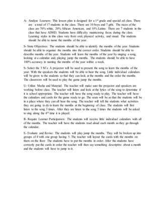 This lesson plan is designed for a 1st grade and special education class of 17 students to teach them the months of the year. There are various learning styles and 7 students have ADHD. The objectives are for students to identify, organize in order, and describe the months of the year through singing a song, using calendars, and playing a game where they jump to different months. Materials needed include a projector, speakers, individual calendars, and month cards for the game. The teacher will prepare the song and activities, have students sing along after listening multiple times, read months on their calendars, and play the month jumping game to reinforce learning and evaluate understanding.