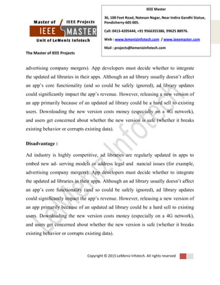 The document discusses analyzing ad library updates in Android apps. It finds that almost half of Android apps underwent ad library updates over a 12 month period, where an ad library was added, removed, or updated. For nearly 14% of app updates with an ad library update, no changes were made to the app's core functionality, suggesting maintaining ad libraries requires substantial effort. The proposed system compares how apps are updated over time to determine if an update includes ad library changes, core changes, or both.
