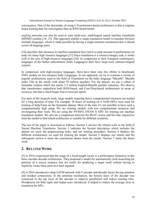 The document analyzes various architectures for neural machine translation (NMT), particularly focusing on using low computational resources. It compares transformer models with LSTM and convolutional networks using an English-Marathi dataset, revealing that transformers deliver better accuracy but at higher training costs, while LSTMs perform well with significantly lower training times. The findings suggest that depending on the computational resources available, different architectures may be more suitable for machine translation tasks.