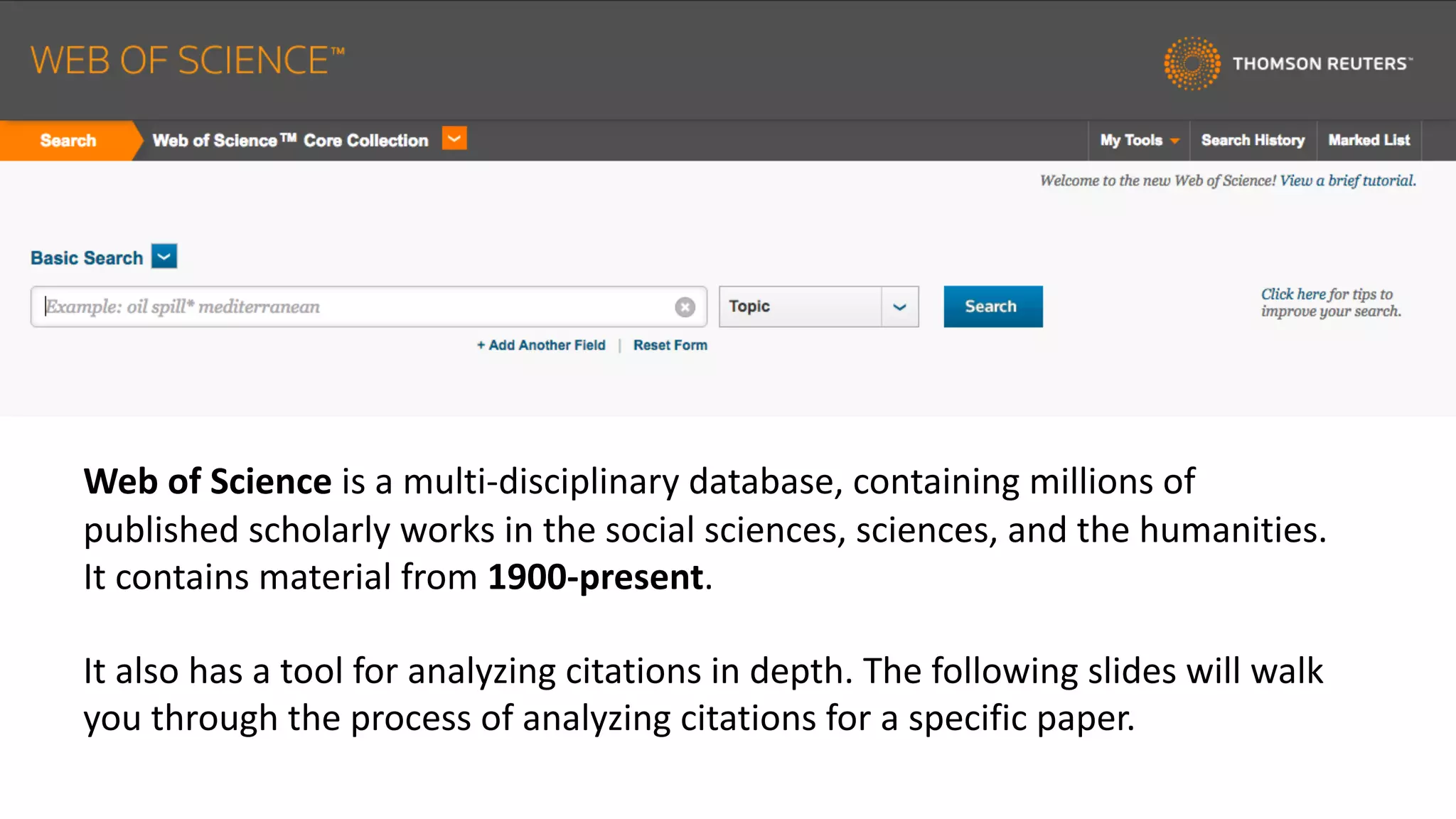 Web of Science is a multi-disciplinary database containing millions of published scholarly works from 1900 to present. It allows users to analyze citations in depth for specific papers, including viewing citing references, cited references, and times cited counts. The document provides a step-by-step guide to using Web of Science's citation analysis tools to explore how a highly cited paper has been used and built upon by other research over time.
