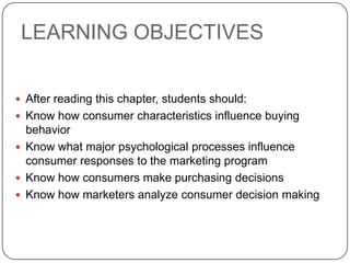 This document outlines key concepts related to consumer buyer behavior and the consumer decision-making process. It discusses how cultural, social, and personal characteristics influence consumer behavior. It also describes the consumer buying process and different types of buying decisions. The central concept is a model of consumer behavior that shows how marketing and other stimuli interact with a consumer's characteristics and decision process to influence their responses.