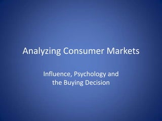 The document discusses the various influences on consumer buying decisions, including cultural, social, and personal factors. It highlights the significance of perception, motivation, learning, and memory in marketing strategy, as well as the stages of the buying decision process. Additionally, it addresses the importance of brand positioning, risk minimization, and customer satisfaction in driving repeat purchases.