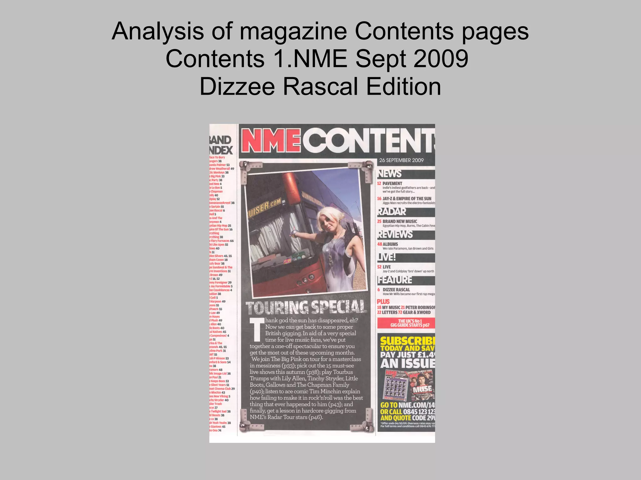 The document analyzes the layout and design features of the contents pages from three different magazine issues. It describes design elements like the masthead, date, main image, article listings, reviews, and notes from the editor. Consistent colors, fonts, and placement of elements are discussed to showcase how the contents pages guide readers through the magazines in an easy to browse format.