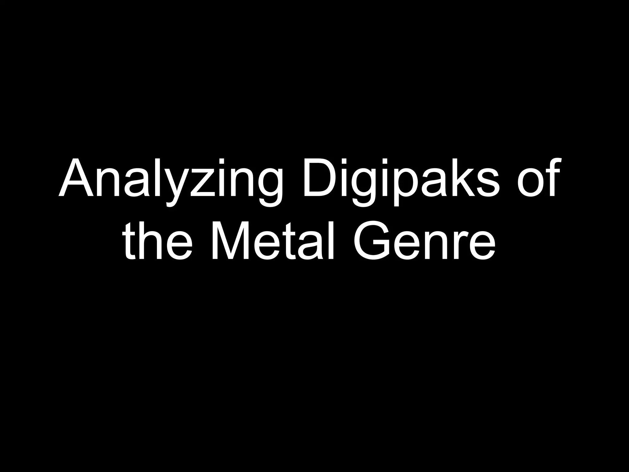 The document analyzes digipaks of three metal albums: Metallica's 'St. Anger,' Black Sabbath's '13,' and Judas Priest's 'Rocka Rolla.' Each digipak is examined for its unique design elements, color schemes, and how they reflect the metal genre's characteristics. Key details include the use of striking imagery, branding choices without including band names, and the overall aesthetic continuity between album front and back covers.