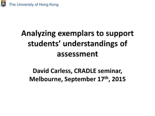 This document discusses the use of exemplars to help students understand assessment. It provides context on a case study where exemplars were used with trainee science teachers. There are several dilemmas in using exemplars, such as whether to directly tell students about quality or have them construct it themselves, and balancing time for student discussion versus teacher input. The case study highlights strategies for managing these dilemmas, such as highlighting valued qualities like creativity, consolidating student insights, and building shared understandings. Ultimately, the use of exemplars can enhance students' understanding of goals and standards if implemented well through strategies like these.