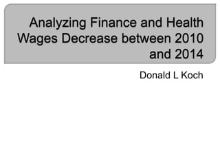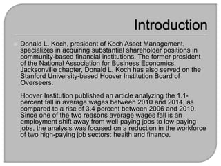 Donald L. Koch, president of Koch Asset Management, focuses on significant shareholder positions in community financial institutions. An analysis published by the Hoover Institution highlighted a 1.1% decrease in average wages from 2010 to 2014, attributed to workforce reductions in high-paying sectors like finance and health due to increased regulations from the Affordable Care Act and Dodd-Frank Act. The document examines the impact of these regulations on labor growth and wages, noting that both finance and health sectors faced significant job losses during this period.