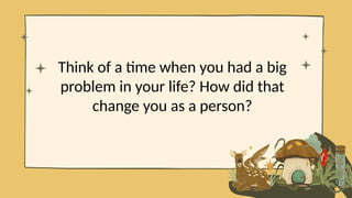 The document explores the theme of conflict in literature, detailing various types including character vs. character, character vs. society, and character vs. nature. It emphasizes the importance of character development and characterization, providing examples from literature and film to illustrate these concepts. Additionally, it includes assessment questions related to understanding and analyzing conflicts and characters within literary texts.