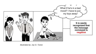The document outlines learning objectives related to identifying and classifying positive and negative messages conveyed through language, both literal and figurative. It provides examples of signal words, phrases, and expressions associated with various contexts of communication, such as expressing gratitude, giving encouragement, and conveying disappointment. Additionally, it explains figurative language elements such as hyperbole, simile, metaphor, and euphemism, emphasizing their role in conveying positive or negative meanings.