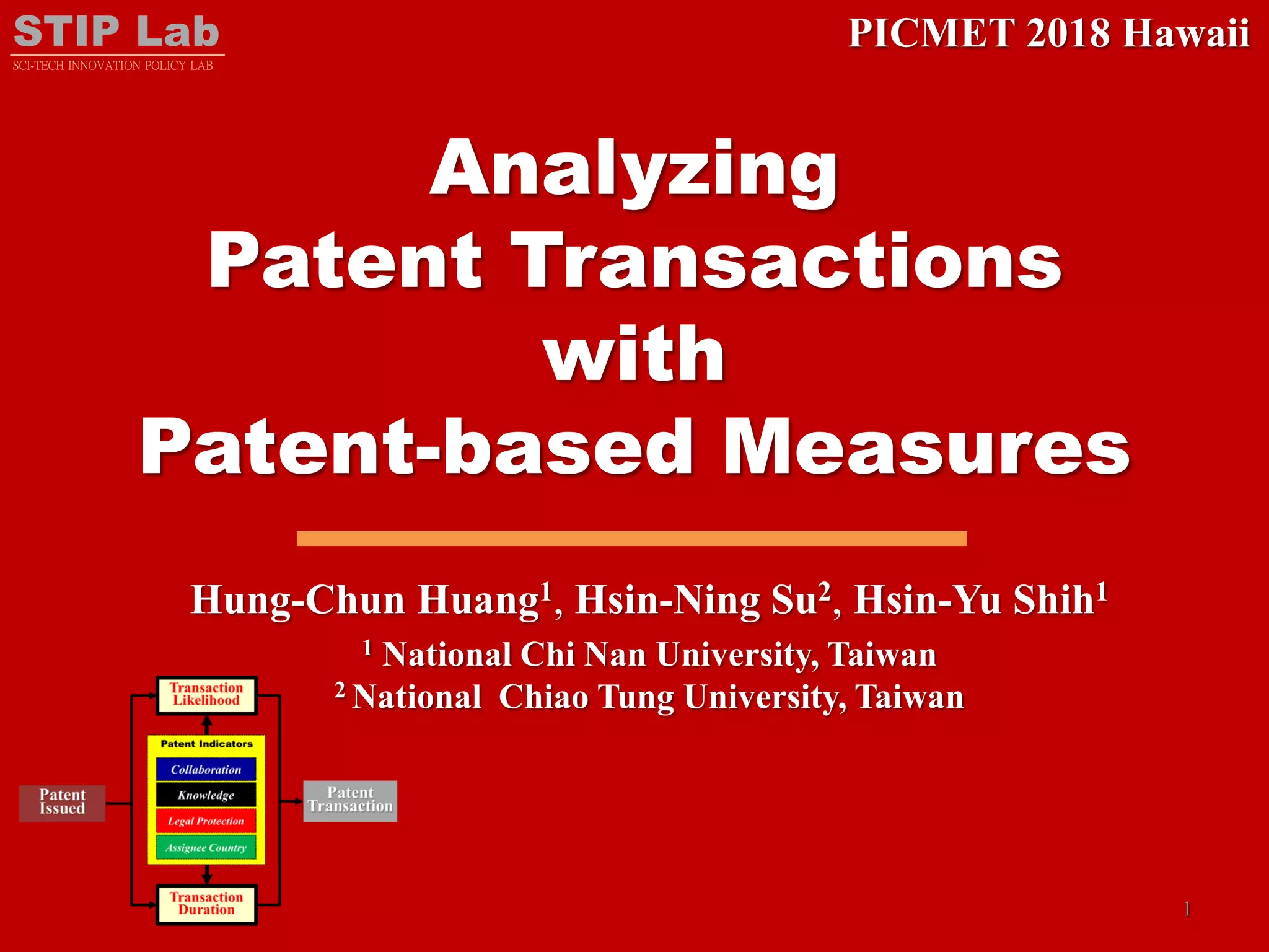 This study analyzed 18,007 patent assignment records from 1978 to 2012 to understand factors that influence patent transaction likelihood and duration. Two statistical models were used to show that collaboration, knowledge, legal and country indicators like assignee count, citations, and originality positively impact likelihood, while factors like non-patent references and foreign assignees decrease likelihood and accelerate transaction speed. The results provide insights into how firms' appropriability concerns and market liquidity affect their willingness to transact patents. This research contributes to understanding the relationship between patents and transactions.
