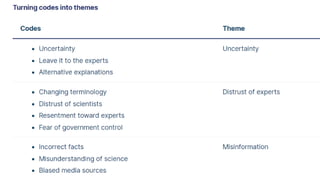 The document discusses the process of thematic analysis for qualitative data. It involves 6 steps: 1) familiarizing yourself with the data by reading transcripts or notes. 2) Coding the data by highlighting key phrases and assigning codes. 3) Generating themes by combining related codes into overarching themes. 4) Reviewing the themes to ensure they accurately represent the data. 5) Defining and naming each theme. 6) Writing up the analysis by introducing the research question and methodology, then discussing each theme with examples from the data. Thematic analysis is used to identify common themes and patterns in qualitative data sources like interviews or surveys.