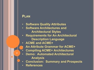 This document discusses analyzing software architectures and architectural styles. It begins by covering software quality attributes and how architectural decisions impact attributes like reliability, safety, security, and others. It then defines what a software architecture is and discusses architectural models for documenting designs. Key characteristics of architectures like structure, communication, and control are explained. Common architectural styles are also outlined, along with how styles are defined by component types, connectors, communication protocols, and semantic constraints. The role of software architecture in enabling reuse is also noted.