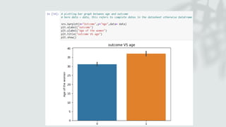The document discusses diabetes as a chronic metabolic disease with different types, including Type 1, Type 2, gestational, and MODY. It provides insights from various data visualizations, indicating trends such as the correlation between age and diabetes risk, the effect of pregnancy on glucose levels, and the relationship between insulin levels and skin thickness. The analysis also highlights BMI distributions among individuals with diabetes.