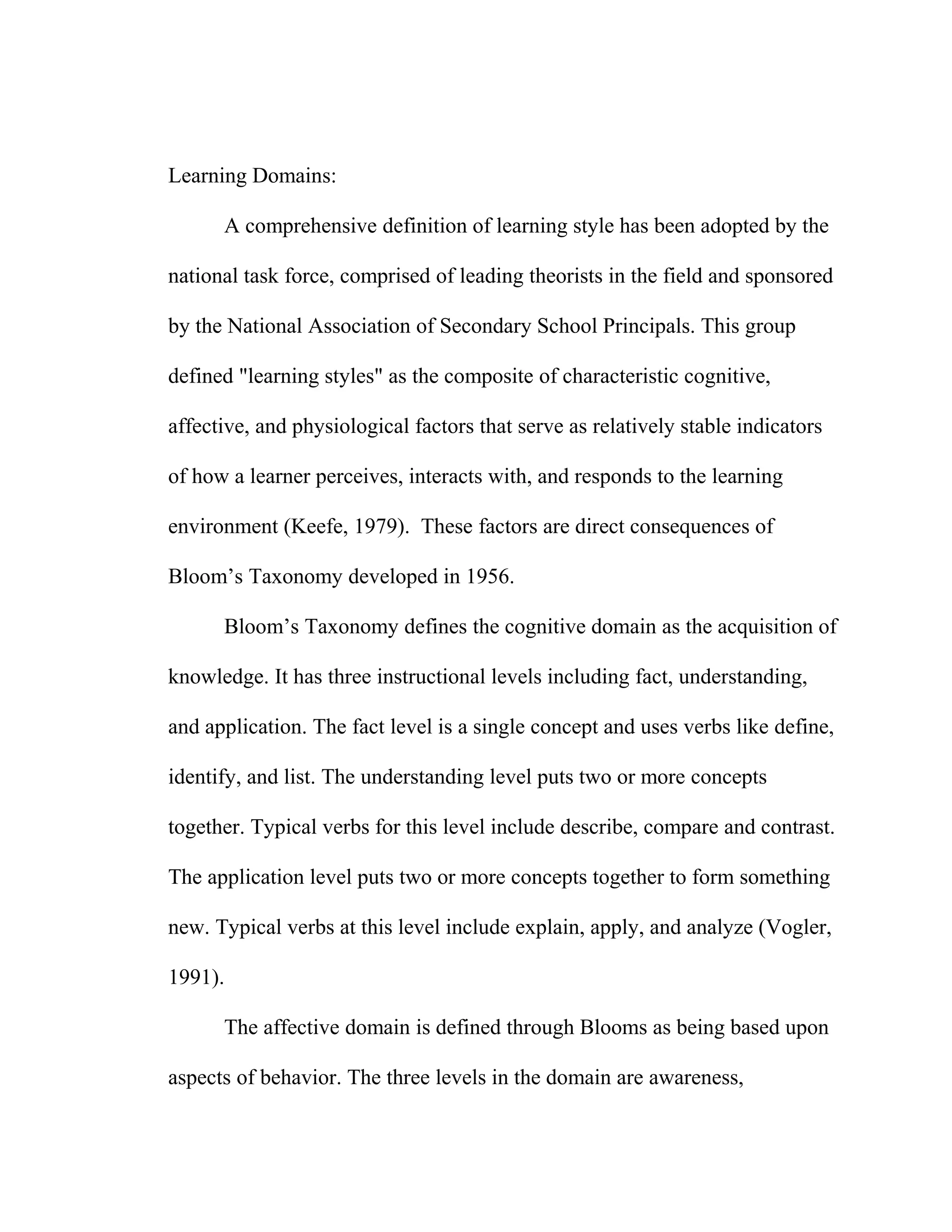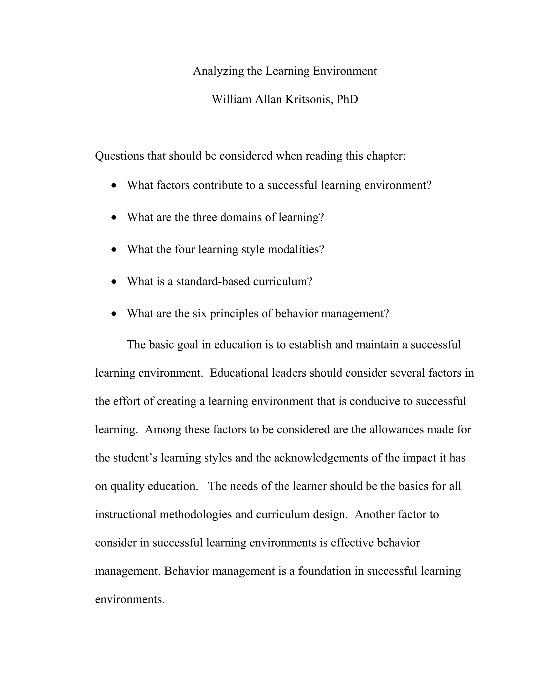 The document discusses factors that contribute to a successful learning environment, including considering students' learning styles, implementing a standards-based curriculum, and establishing effective behavior management. It covers the three domains of learning - cognitive, affective, and psychomotor - defined by Bloom's Taxonomy, as well as the four learning style modalities of auditory, visual, tactile, and kinesthetic learners. The document emphasizes that behavior management should focus on positive reinforcement and establishing an environment conducive to learning.