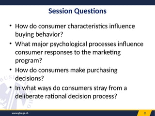 The document discusses the various factors influencing consumer behavior, highlighting the importance of understanding market characteristics before developing marketing strategies. It explores cultural, social, and personal factors that affect purchasing decisions, as well as psychological theories like Maslow's hierarchy of needs and the consumer buying process. The document emphasizes the need for marketers to consider how consumers perceive and evaluate products, as well as the impact of perceived risks in their decision-making.